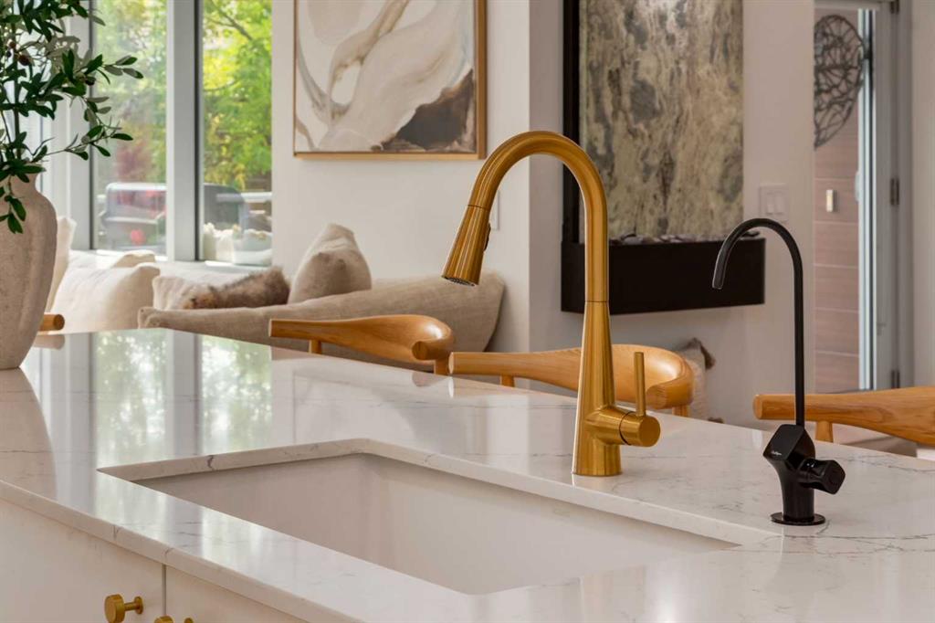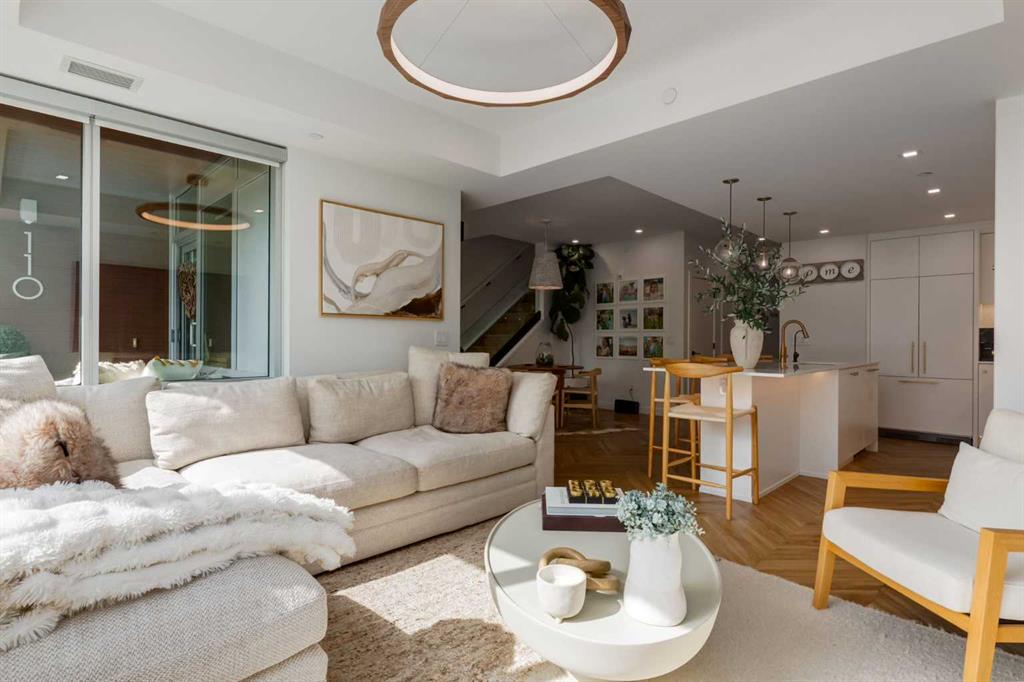 OPEN HOUSE SATURDAY DECEMBER 6TH, FROM 12PM TO 4PM. Experience luxury living in a sophisticated THREE BEDROOM Brownstone residence with over 2000 SF of interior living space and over 500SF of outdoor garden terrace space. Designed with both privacy and entertaining in mind, the home boasts upper-level south-facing bedrooms with large mature trees set behind, a dedicated gym area, a south-facing patio with room for an outdoor living room and an upper level deck, perfect for relaxation or gatherings. The chef-inspired kitchen is a true centerpiece, featuring Supermatte slate white cabinetry with brushed-gold hardware, a high-end gas cooktop and wall oven, an integrated 36" Fisher & Paykel fridge, integrated dishwasher, soft-close drawers, under-cabinet lighting, and stunning quartz countertops and backsplash. The dining room is open to the kitchen and cozy living room area. The interior design is spectacular featuring a Nordic-inspired floating fireplace, Chevron flooring, a bespoke granite waterwall feature, and designer lighting. A spacious walk-in pantry ensures ample storage for all your culinary needs. Modern upgrades include Japanese-style toilets, high-flow rain shower heads, and under-cabinet lighting throughout the kitchen and bathrooms, bringing contemporary elegance to every space. Sunlight fills the home through large windows, complemented by roller shades for privacy. Additional features include a full-size washer and dryer, custom built-in cabinetry, and a patio gas line for effortless outdoor cooking. This exceptional home includes two titled parking stalls in a heated, secured underground parkade, offering convenience and peace of mind. Located just steps from the award-winning eight-acre Radio Park, residents can enjoy a vibrant lakeside destination complete with fountains, boardwalks, scenic overlooks, dog parks, an amphitheatre and lush landscaping. The park is designed to offer year-round activities including a performance venue, winter ice rink, and dining experiences. Residents also benefit from a rooftop patio on the 8th floor, a second floor private owner’s lounge, underground visitor parking, bike storage, EV charging stations, and concierge services. The West District community continues to expand with retail shops, pedestrian-friendly sidewalks, bike paths, a central park, outdoor amphitheater, skatepark, seasonal markets, a transit hub, supermarket, and sports courts. Ideally situated, the home is just 15 minutes to downtown Calgary, one hour to the mountains, and 5 minutes to Winsport Canada Olympic Park, offering an unbeatable combination of lifestyle and convenience.