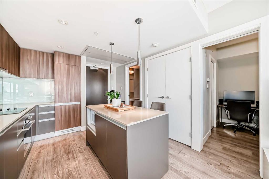 Step inside to discover a thoughtfully designed layout featuring a sleek kitchen with integrated appliances, quartz countertops, and full-height cabinetry. The central island provides additional workspace and casual seating, seamlessly connecting to the living area that’s flooded with natural light from floor-to-ceiling windows. The private balcony offers a front-row seat to sweeping skyline views—perfect for unwinding after a long day. The bedroom is spacious and well-separated from the den, offering privacy and flexibility whether you’re working from home or setting up a creative corner. A modern 4-piece bathroom and in-suite laundry add both comfort and function to the space. This unit is meticulously maintained, making it ideal for professionals, first-time buyers, or investors seeking a low-maintenance lifestyle in the urban core.