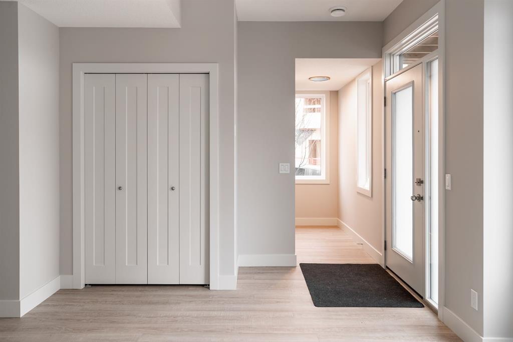 Ravines of Royal Oak by Janssen Homes offers unmatched quality & design, located on the most scenic & tranquil of sites in the mature NW community of Royal Oak. This 2BR, 1-full bath 1,233sf (1,233RMS) 24’-wide stacked townhouse with single attached garage boasts superior finishings. Open-concept-plan features a fresh, modern kitchen with full-height cabinets, soft close doors/drawers & full extension glides, quartz counters, undermount sink, plus 4 S/S appliances & convenient peninsula island opening onto both dining area with access to rear balcony & spacious living room. With over 900sf on the second living level there is ample space for a roomy master retreat, 4-pce bath with tile floor & quartz vanity, an additional bedroom which can be used as an office, & ultra-convenient laundry area. Convenient flex room on the main level along with a single attached garage with room to park an extra car on front driveway completes the package. Ravines of Royal Oak goes far beyond typical townhome offerings; special attention has been paid to utilizing high quality, maintenance free, materials to ensure long-term, worry-free living. Acrylic stucco with underlying 'Rainscreen' protection, stone, & Sagiwall vertical planks (ultra-premium European siding) ensure not only that the project will be one of the most beautiful in the city, but that it will stand the test of time with low maintenance costs. Other premium features include triple-pane, argon filled low-e, aluminum clad windows, premium grade cabinetry with quartz countertops throughout, 9' wall height on all levels, premium Torlys LV Plank flooring, 80-gal hot water tank, a fully insulated & drywalled attached garage that includes a hose bib & smart WiFi door opener, among other features. Condo fees include building insurance, exterior building maintenance & long-term reserve/replacement fund, road & driveway maint., landscaping maint., driveway & sidewalk snow removal, landscaping irrigation, street & pathway lighting, garbage/recycling/organics service. Bordered by ponds, natural ravine park, walking paths & only minutes to LRT station, K-9 schools, YMCA & 4 major shopping centres. Note - photos from a similar model in the complex.