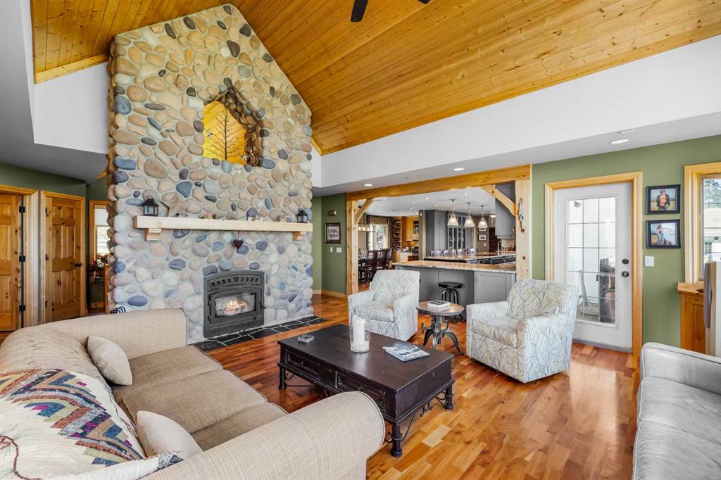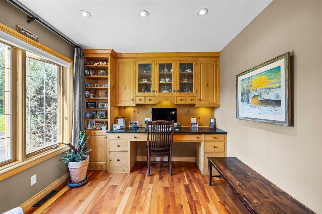 bookcases, built-in features, ceiling fan(s), chandelier, open floorplan, vaulted ceiling(s)