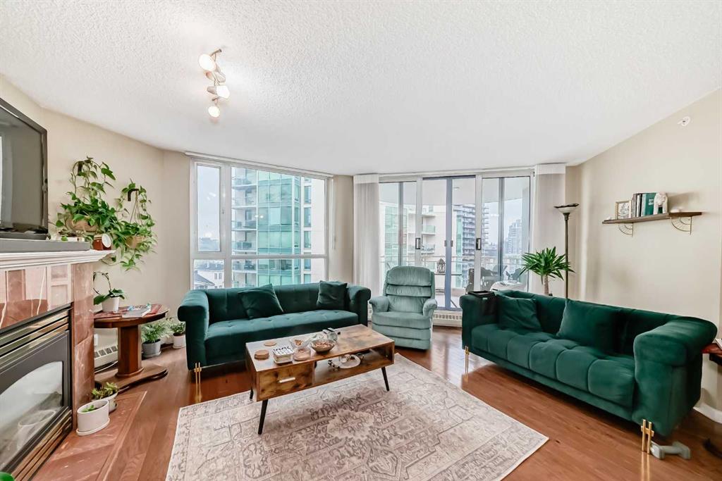Welcome to the Liberte eau claire a great place to call home. This 2 bedroom unit with den has river and city views from the 2 balconies off of the den and living room. The open concept living -dining area has a gas fireplace, balcony and engineered hardwood floors, the kitchen has an island with breakfast bar, stainless steel appliances as well as granite countertops in kitchen and bathrooms. Double french doors lead to the den with a second balcony. Both bedrooms have large windows, with vinyl plank flooring and the master features his and hers walk through closet area, a 4 piece ensuite bathroom as well as laundry area with storage. There is an underground titled parking stall as well as a storage unit on the P 1 level. The Liberte amenties include a large party room with full kitchen, a well equipped gym, bike storage and an outdoor tennis court. Easy walk to the river and princes island park, as well as bike paths, restaurants , transit and shopping.