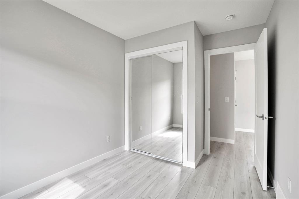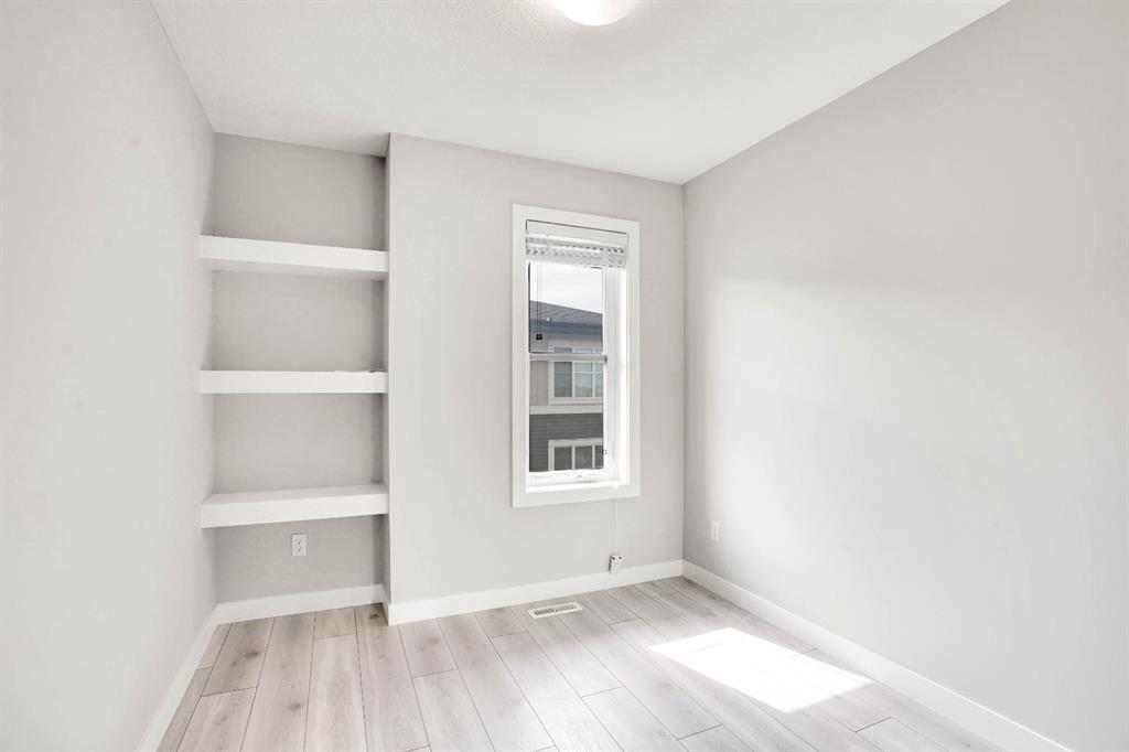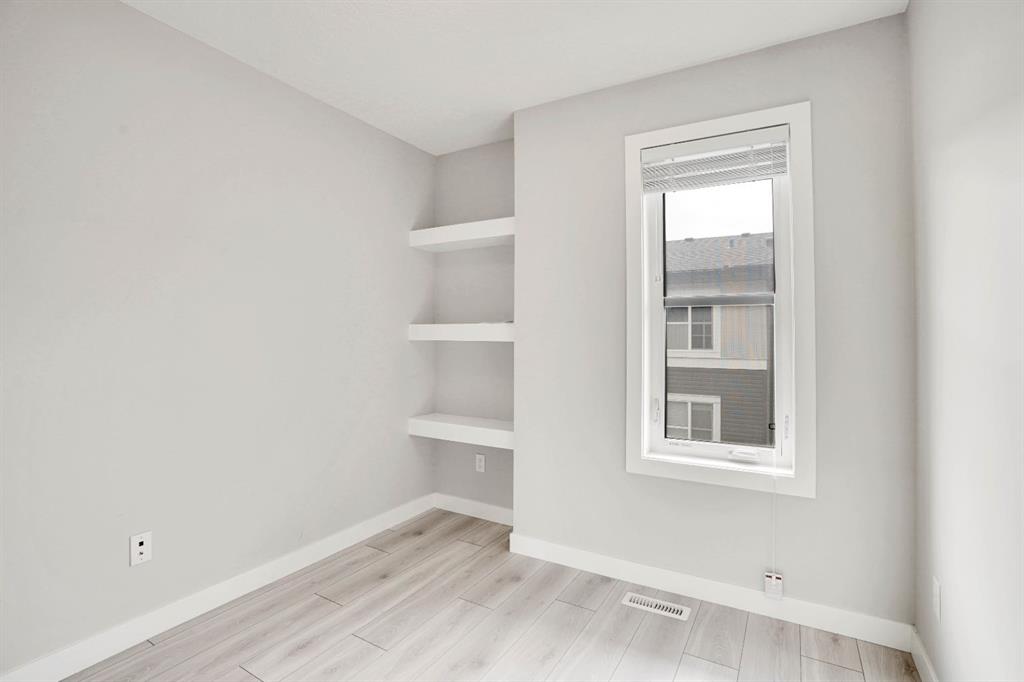 The top floor offers three generous bedrooms, including a primary suite with a walk-in closet, built-in wall lighting, mounted TV (included), and a private en-suite. One of the secondary bedrooms even includes a built-in shelving unit. Laundry is conveniently tucked away behind closet doors just steps from the bedrooms.