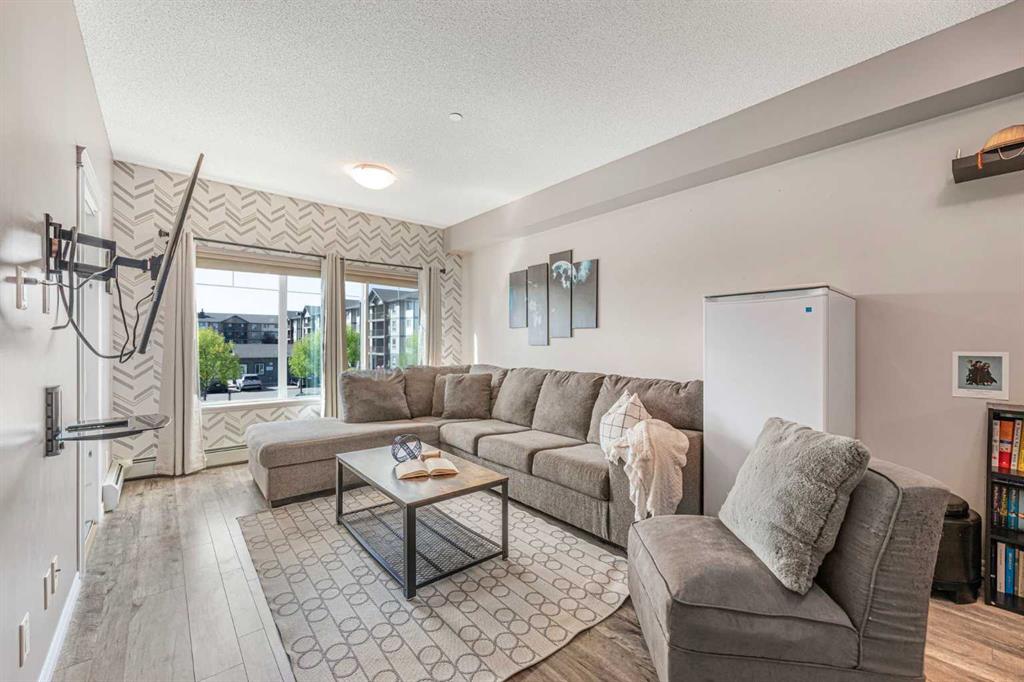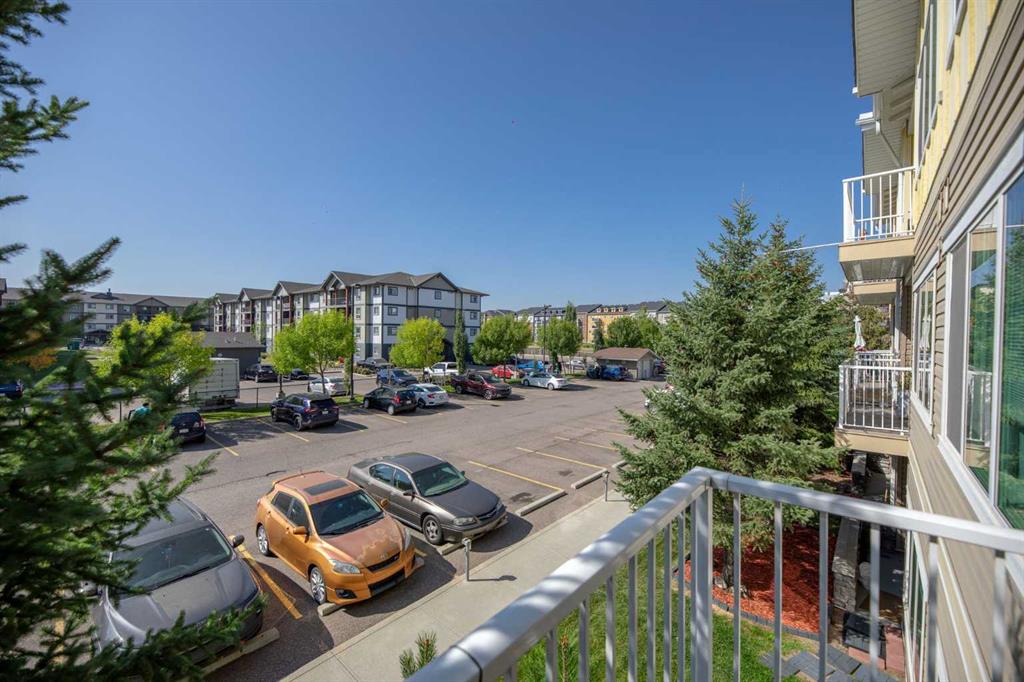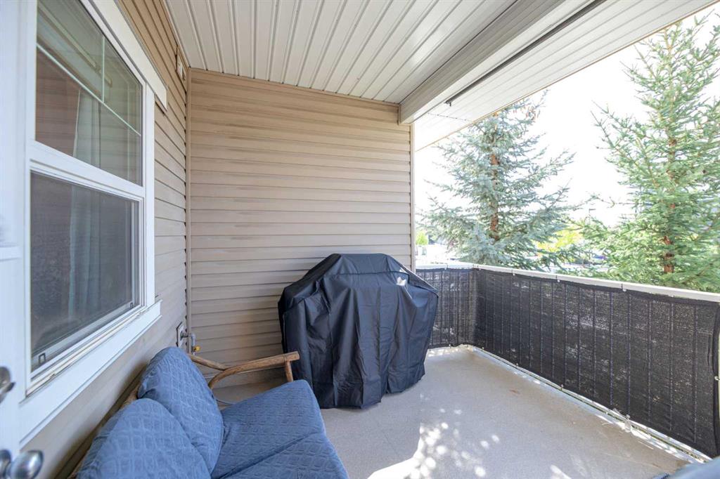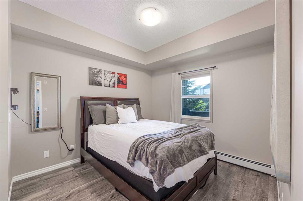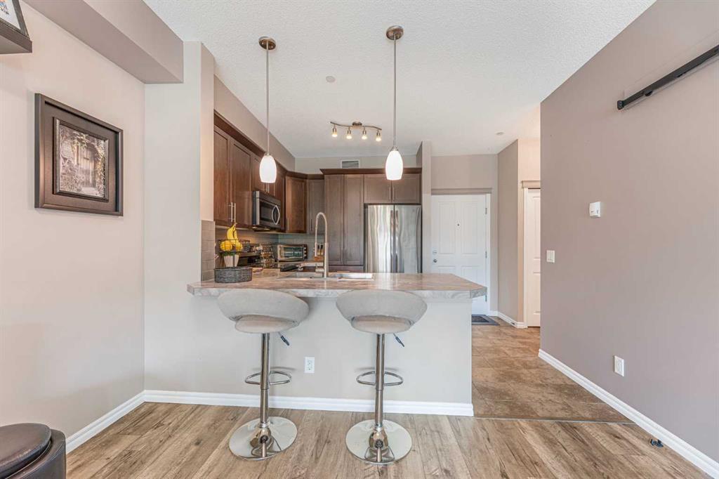 Welcome to The Courtyards in Kings Heights. This one bedroom suite is a must see and offers two parking stalls. The home has been tastefully updated over the years with kitchen and bathroom sinks and faucets (2021), high end laminate barnwood flooring, a stylish barn door, full height kitchen cabinets, backsplash, and ceramic tile in the entry (2021). Window coverings and a Phantom screen door to the balcony were also added in 2021. More recent upgrades in 2025 include a new shower head, a bidet, and a sunshade on the balcony. A storage cage is also included. This suite combines thoughtful details, ample storage, and the convenience of two parking stalls. Located close to Deerfoot, Yankee Valley Boulevard, shopping just across the street, and surrounded by beautiful walking paths, this home offers both comfort and convenience.