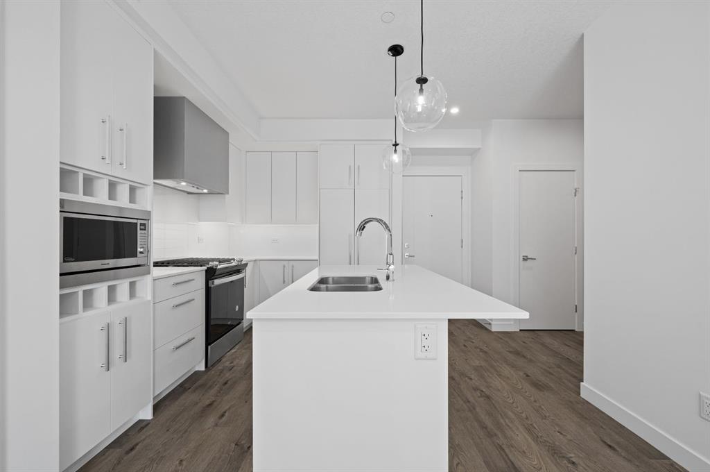 Nestled in the vibrant West District, Mondrian offers a perfect balance of style, functionality, and modern urban living. This 2-bedroom, 2-bathroom + den residence is thoughtfully designed to maximize space while maintaining an inviting, upscale atmosphere—perfect for those who appreciate both comfort and convenience. From the moment you step inside, the open-concept layout creates a seamless flow between the chef-inspired kitchen, dining, and living areas. Premium finishes and high-end appliances—including an integrated refrigerator, gas range, and built-in microwave—add a touch of sophistication, making everyday living both effortless and elegant. The primary bedroom, features a walk-through closet and a 3-piece ensuite with a sleek glass-enclosed shower. A second spacious bedroom provides flexibility for family, guests, or a home office. The den offers additional versatility, perfect for remote work, a creative space, or extra storage. Enjoy the added luxury of in-suite laundry, air conditioning, and stylish window coverings, ensuring a turnkey, move-in-ready experience. The private balcony extends your living space outdoors—ideal for morning coffee or unwinding at the end of the day. Beyond your home, Mondrian elevates the urban lifestyle with a rooftop terrace, offering breathtaking views, stylish seating areas, and the perfect ambiance for relaxation or entertaining. Situated just steps from boutique shops, gourmet dining, green spaces, and everyday essentials, this home delivers unparalleled convenience in one of Calgary’s most desirable neighbourhoods. With Titled Underground Parking, your vehicle stays secure and accessible year-round. This isn’t just a home—it’s an exceptional opportunity to live in the heart of West District. Don’t miss your chance to experience the best of urban living—Mondrian is waiting for you!