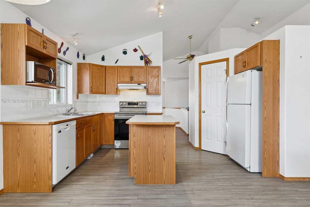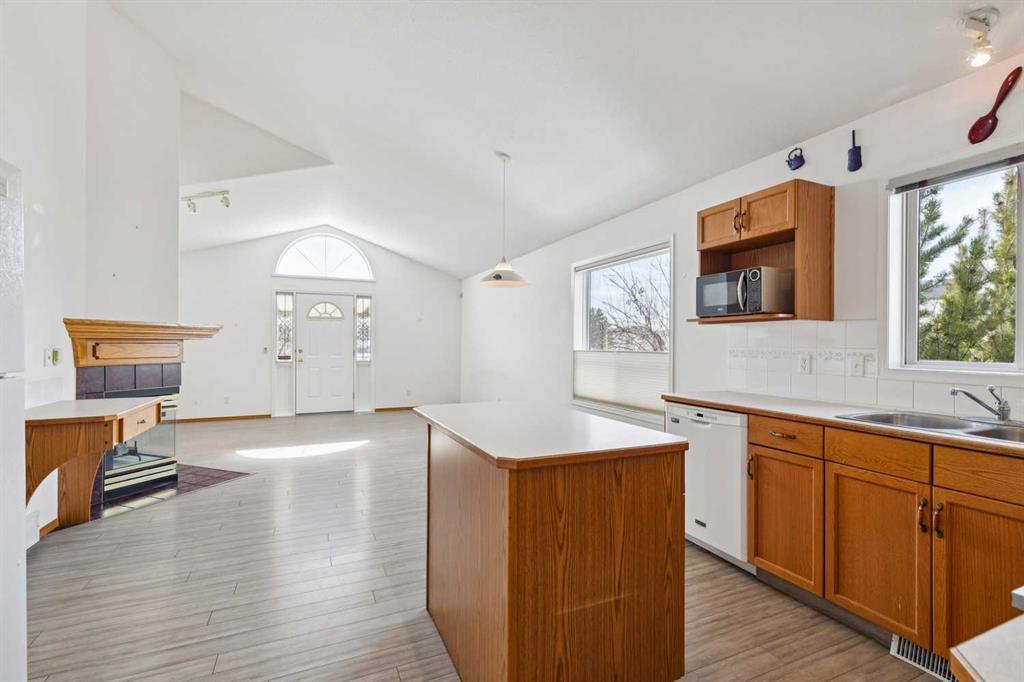 Close to walking natural reserve walking paths this inviting, bright bilevel home offering a spacious living area, open kitchen and a dining room perfect for family meals and entertaining guests. This home is nestled between beautiful greenspace in front of and behind the property. The main floor features two comfortable bedrooms, including a primary bedroom with its own ensuite, plus an additional full bathroom. Large windows fill the main floor with natural light, highlighting the open living area with its cozy fireplace. Off the living room, a covered patio overlooks the greenspace and the large yard filled with mature fruit trees, creating a peaceful setting that’s hard to find. For added peace of mind, the POLY-B has been fully replaced.