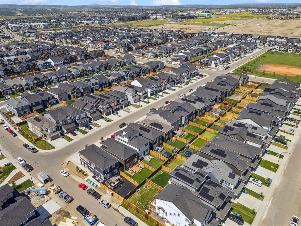 The basement is framed and ready for future development, with a bathroom already roughed in. Outside, the landscaped yard offers year-round enjoyment with a composite deck, permanent Govee exterior lighting, a powered gazebo, and a storage shed. The attached garage is heated and includes built-in ceiling storage and cabinets for optimal organization. This home offers convenient access to the South Health Campus, YMCA, schools, restaurants, shopping, and everyday services. New HOA facility is open and designed to elevate your lifestyle with amenities such as a skating rink, splash pad, tennis and basketball courts, fire pits, a café, and bookable indoor spaces for events like birthdays or private gatherings. From solar panels(6) and hot water on demand to luxury finishes throughout, this home delivers unmatched value in a prime location- truly a must see!