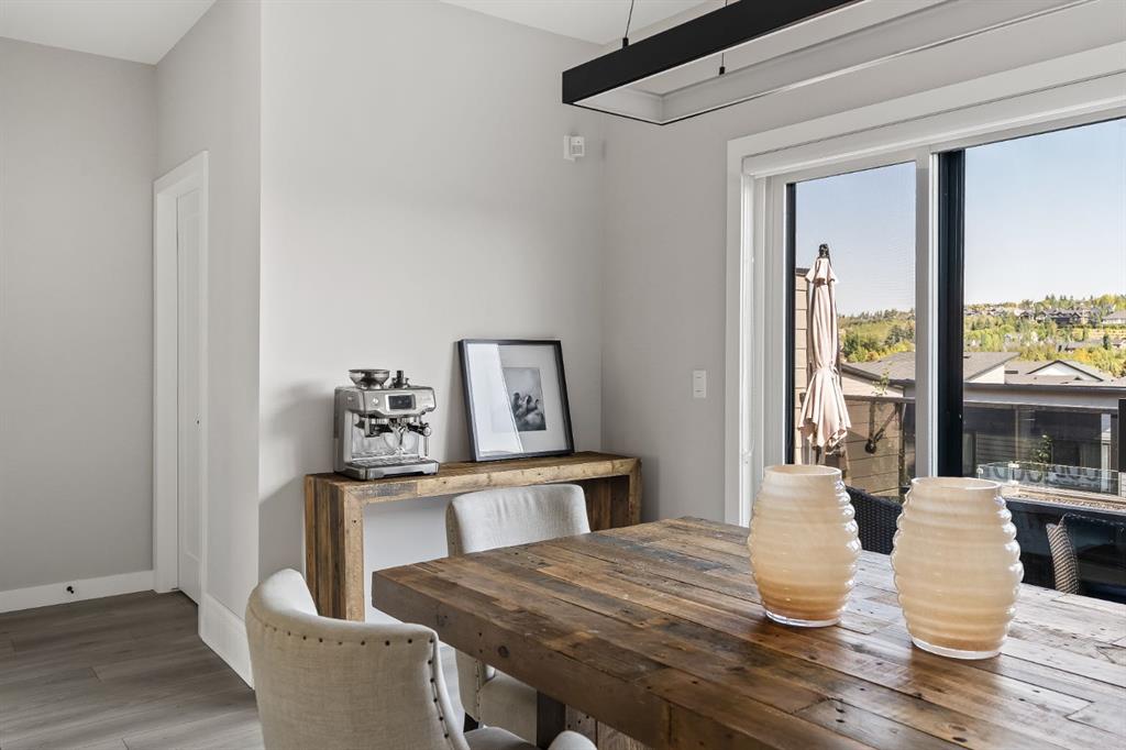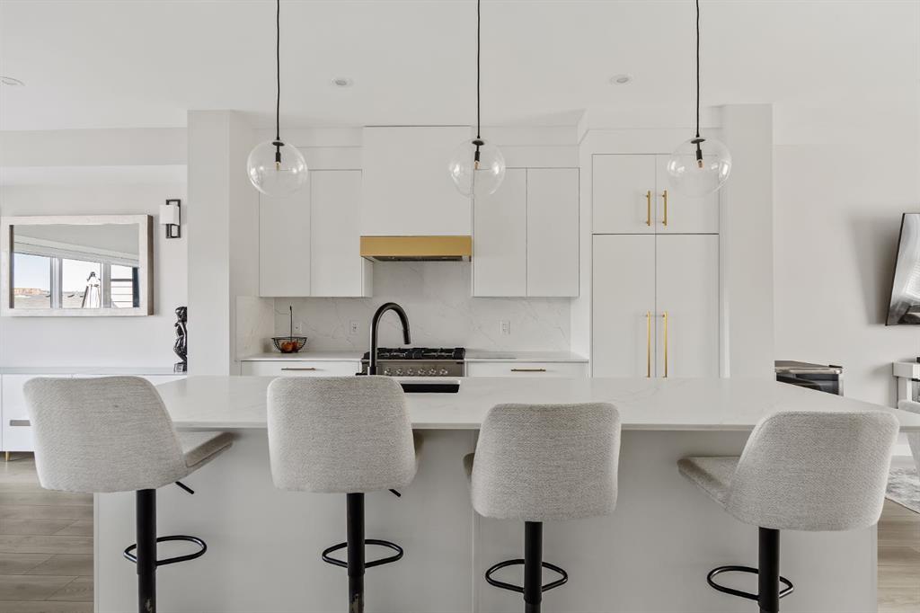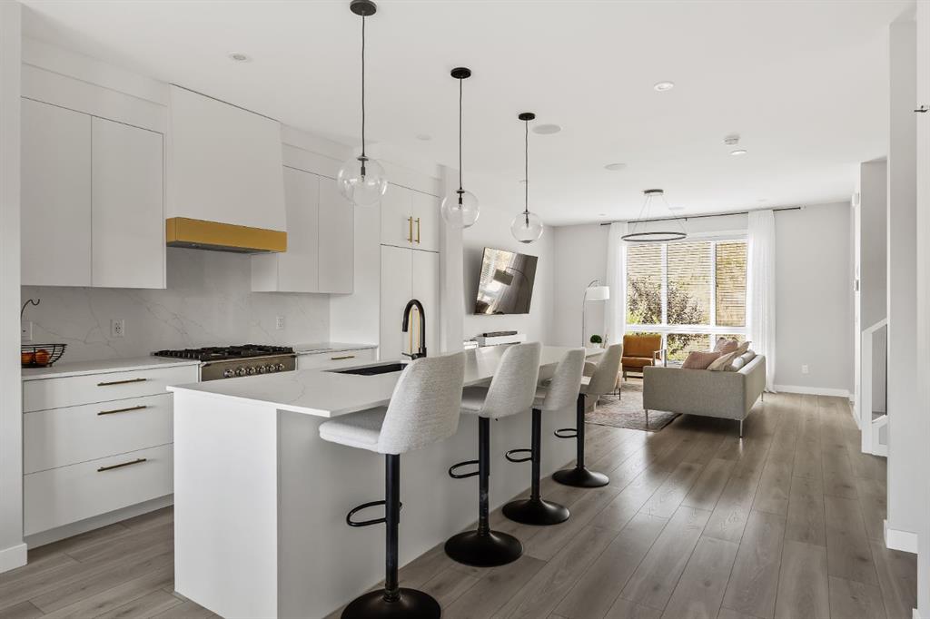 Executive living at its finest on Calgary’s WONDERFUL Upper Westside. This three storey townhome, just three years young, offers 2565 sq ft of living space over three levels with all of the latest design elements. Situated at the top of the hill this home presents a wonderful view to the SE, all the way to the Glenmore reservoir and exposure to a grassy knoll and the mountains to the west – a COMFORTING sense of space. With its east/west orientation, and generous window treatments, this home follows the sun, offering a WARM & BRIGHT home, on all three levels. On arrival you will enjoy the broad, open plan under 9’ ceilings with resilient luxury vinyl flooring, designer lighting and window treatments and a kitchen featuring Fisher Paykal s/s appliances, including a gas stove. There is a generous dining space here, leading directly to a large rear deck, measuring 240 sq ft – WITH A VIEW! Upstairs you will find a double primary floor plan. The primary bedroom sits under 10’ ceilings with a view to the west and features a 5pc en suite with quartz countertops and large walk-in closet. The second primary enjoys views to the Glenmore reservoir, a 4pc en suite and large walk-in closet. The lower level has been developed for entertaining with a large rec/media space leading directly to a second large covered deck… 423 sq ft with a fantastic HOT TUB… WITH A VIEW! This level also enjoys a large flex space, which easily accommodates a sleeping space for guests and a 3rd full bathroom. This home offers an attached, HEATED & OVER-SIZED garage, multi media ethernet cabling and 15 B/I speakers throughout and an ELEVATOR serving all four levels! This is a turnkey lifestyle with an ELEVATOR which presents an opportunity to age in place… on Calgary’s Upper Westside!!