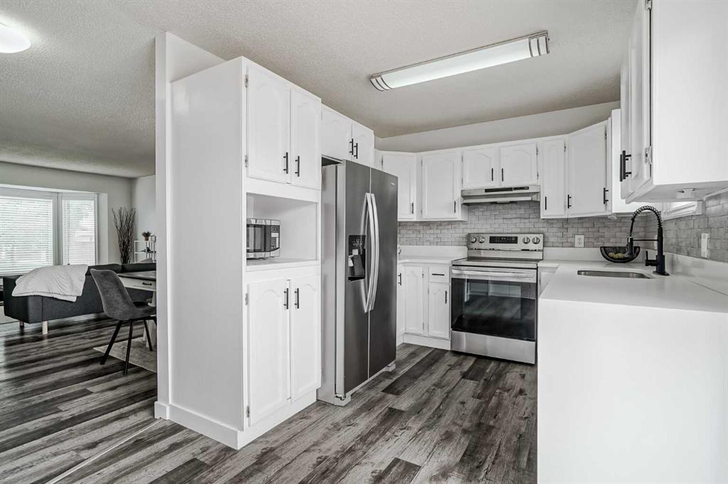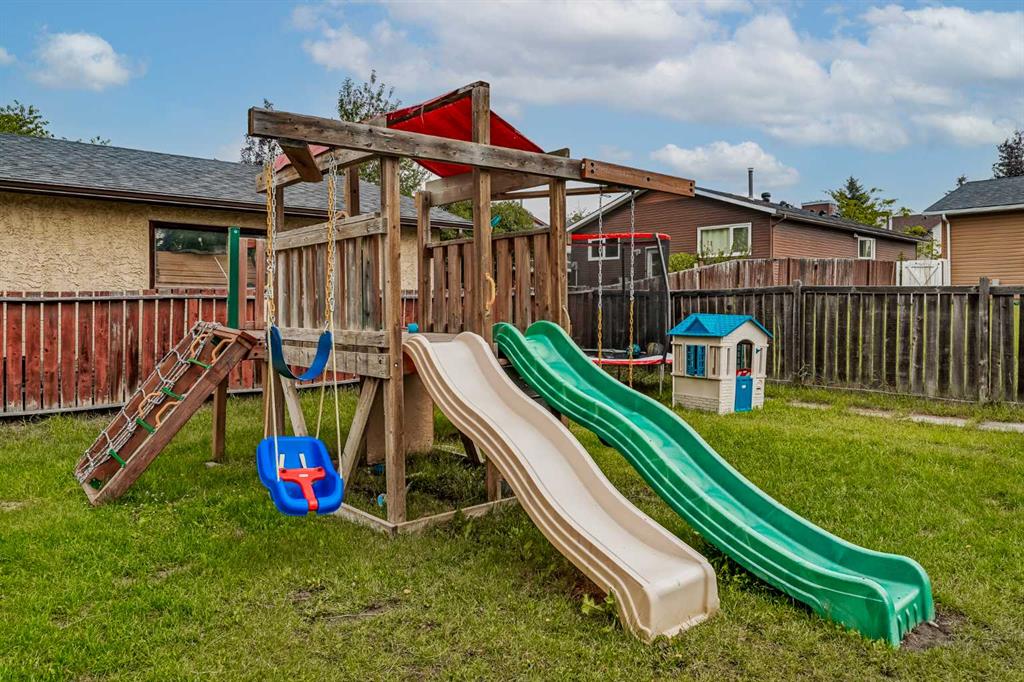 OPEN HOUSE THIS SATURDAY FROM 2:00-4:00PM! Welcome to this beautifully updated 4-bedroom home with a double attached garage, offering over 2,000 sq ft of versatile living space in a family-friendly community. From the moment you step inside, you're greeted by stylish new vinyl plank flooring and a striking feature wall that sets the tone for the rest of the home. The updated kitchen is both functional and inviting, featuring white cabinetry, a brand-new STAINLESS STEEL REFRIGERATOR & DISHWASHER. There are sliding patio doors just off of the kitchen that lead to good sized deck—perfect for summer barbecues and gatherings. Step outside to discover an expansive backyard that’s truly a standout feature. With a huge playset for the kids and plenty of room to run, garden, or simply relax, it’s the kind of outdoor space that grows with your family. Whether it's weekend adventures or after-school fun, the yard is ready for it all. Upstairs, you’ll find three generous bedrooms, including a spacious primary suite with a private 2-piece ensuite. Both the ensuite and main bathroom have been UPGRADED with stylish new vanities, while the main bathroom also showcases a beautifully tiled shower—adding a touch of modern luxury to your daily routine. The lower level is a true highlight, boasting a massive family room anchored by a charming BRICK FIREPLACE and a convenient side entrance—ideal for entertaining, or multi-generational living. The basement offers even more flexibility with a large recreational room that has a spacious laundry section with newer WASHER & DRYER (2023). A fourth bedroom completes this level perfect for guests, a home gym, or an office. Location is the cherry on top—you’re just a SHORT WALK from the C-TRAIN, schools, shopping, and all essential amenities, making daily life a breeze. Additional updates include a NEWER FURNANCE (2023), giving you peace of mind for years to come. With thoughtful upgrades, an unbeatable location, and space for everyone to thrive, this home checks all the boxes. Don’t miss your chance to make it yours!