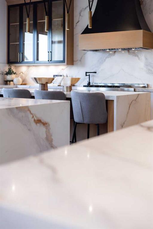 Upstairs, the primary suite is a serene retreat with a boutique-style walk-in closet, spa-inspired ensuite with soaking tub and rainfall shower, and space for private lounging. Three additional bedrooms each feature their own ensuite and walk-in closet, while a flex loft/media space and a fully outfitted laundry room complete the level. The lower level is designed for recreation and relaxation, offering a spacious rec room with wet bar, fitness studio, plush theater room, and two additional bedrooms. Radiant in-floor heating throughout the lower level ensures year-round comfort. Set on a beautifully landscaped 0.28-acre lot, this home includes speaker zones, central vac, gas BBQ hookup, gas garage heater and smart-home rough-ins for modern living. Beyond the property, Watermark is one of Calgary’s most sought-after family communities, renowned for its strong sense of community, scenic pathways, and access to top schools and amenities. With nearby shopping, dining, recreation centers, and a quick drive into the city, it is the perfect balance of tranquility and convenience.