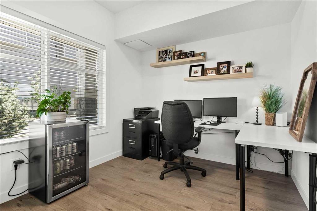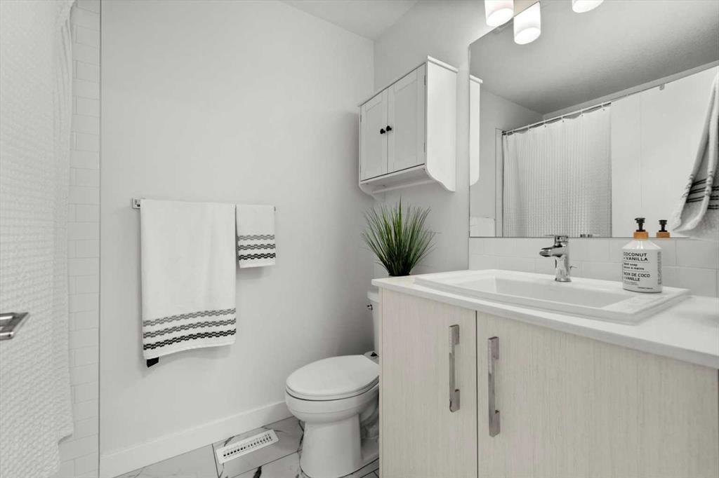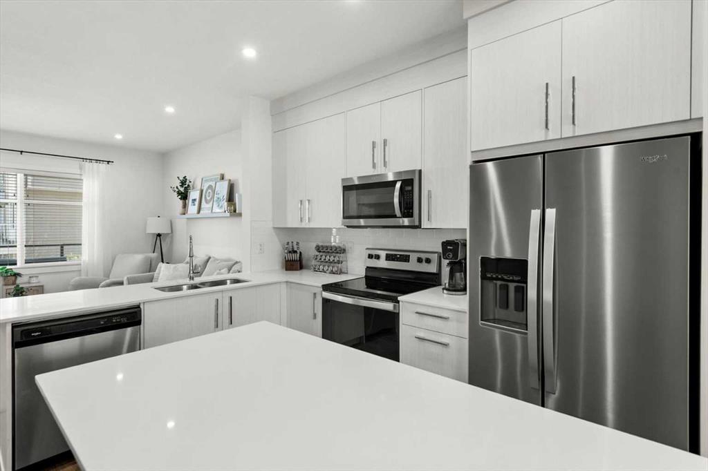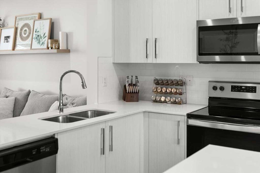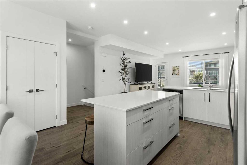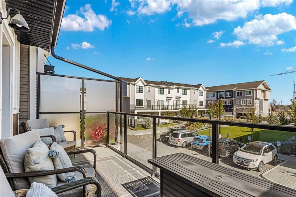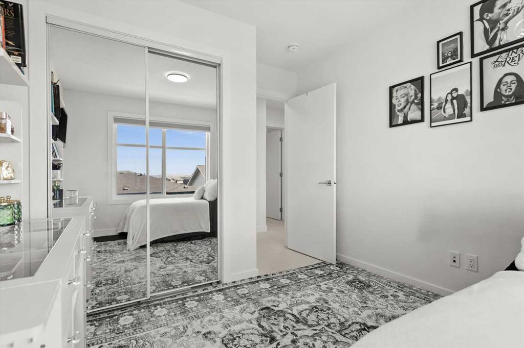 Welcome to this beautifully upgraded townhome in the vibrant, family-friendly community of Carrington. Living here means you can grab your morning coffee at the nearby plaza, take a jog or bike ride on one of the many trail systems, or enjoy a quick commute downtown or out to the mountains on weekends. This thoughtfully designed four-bedroom, two-and-a-half-bathroom townhome offers 1,675 square feet of Air-Conditioned living space incorporating both modernized style and practicality. As you enter, you are greeted by a versatile main-floor bedroom that can serve as a private home office, fitness room, or guest suite. The attached & drywalled double garage not only provides secure parking it is complimented with a convenient water tap, perfect for keeping your car spotless year-round or rinsing off sports gear. Upstairs, the bright & spacious open-concept second level is ideal for entertaining and everyday living. Large windows fill the space with natural light, highlighting the stylish finishes and upgraded details throughout. The spacious kitchen is a chef’s dream, featuring a central island with seating, upgraded quartz countertops, a premium stainless steel appliance package, and plenty of cabinetry and storage solutions. Adjacent to the kitchen is the generously sized dining area creating a warm, welcoming space to gather, perfect for hosting dinner parties with family and friends. Designed for both comfort and sophistication, the living room creates a gathering place to enjoy the latest film release or cheer on your team, then step out to the balcony which is an ideal spot to sip a glass of wine at sunset or enjoy a quiet morning coffee. Completing this level is the private 2-piece powder room. The upper level is thoughtfully designed to be a quiet retreat from the bustle of daily life, with three well-proportioned bedrooms that offer space for everyone. The spacious primary suite feels like your own personal sanctuary, complete with a walk-in closet to keep life organized and a private four-piece spa-inspired ensuite where you can truly unwind. This is a place to recharge, whether that means cozying up with a book, getting ready for a night out, or simply taking a moment for yourself. Two additional bedrooms provide the flexibility to create a children’s wing, a dedicated home office, or a guest room. The second full bathroom makes busy mornings smooth and stress-free, while the conveniently located laundry area keeps chores efficient and out of sight. Outside, residents of this well-managed complex enjoy a beautifully landscaped courtyard, plenty of visitor, street parking, and a welcoming community feel. Carrington has an increasing selection of shops, restaurants, and services just steps away, and plans for future schools and even an LRT stop. Whether you are a growing family, a busy professional, investor, or someone looking for a low-maintenance lifestyle with room to host and entertain, this townhome is the perfect blend of comfort, style, and community.
