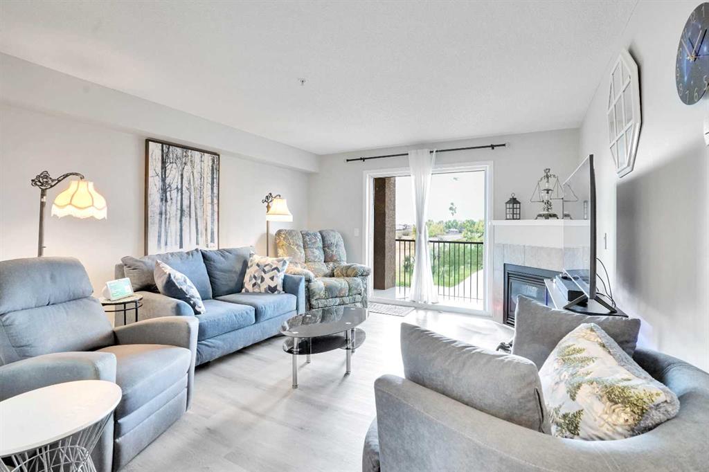 Welcome to this charming two bedroom, one bath home backing onto Iron Horse Park! Imagine enjoying sun filled days on your south facing deck, sipping coffee, or your beverage of choice, while soaking in the peace and quiet of the expansive green space. This home features warm-toned, newer laminate flooring throughout with no transition strips, meaning no trip hazards with a seamless flow from room to room. The spacious foyer offers a large double closet and opens up into the dining room, kitchen, and living room. You'll find a recessed nook perfect for a dining hutch, plus plenty of space for a large table, ideal for family meals. The kitchen is thoughtfully designed with ample storage and counter space for easy meal prep, along with bar-height seating that’s both functional and perfect for entertaining. The stainless steel appliance package includes a fridge, newer stove, dishwasher, and built-in microwave. The bright and spacious living room features a cozy corner gas fireplace and offers stunning views of Iron Horse Park. Nearly every room in this home overlooks the park, creating a peaceful, relaxing atmosphere.