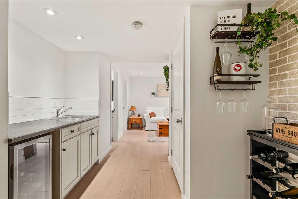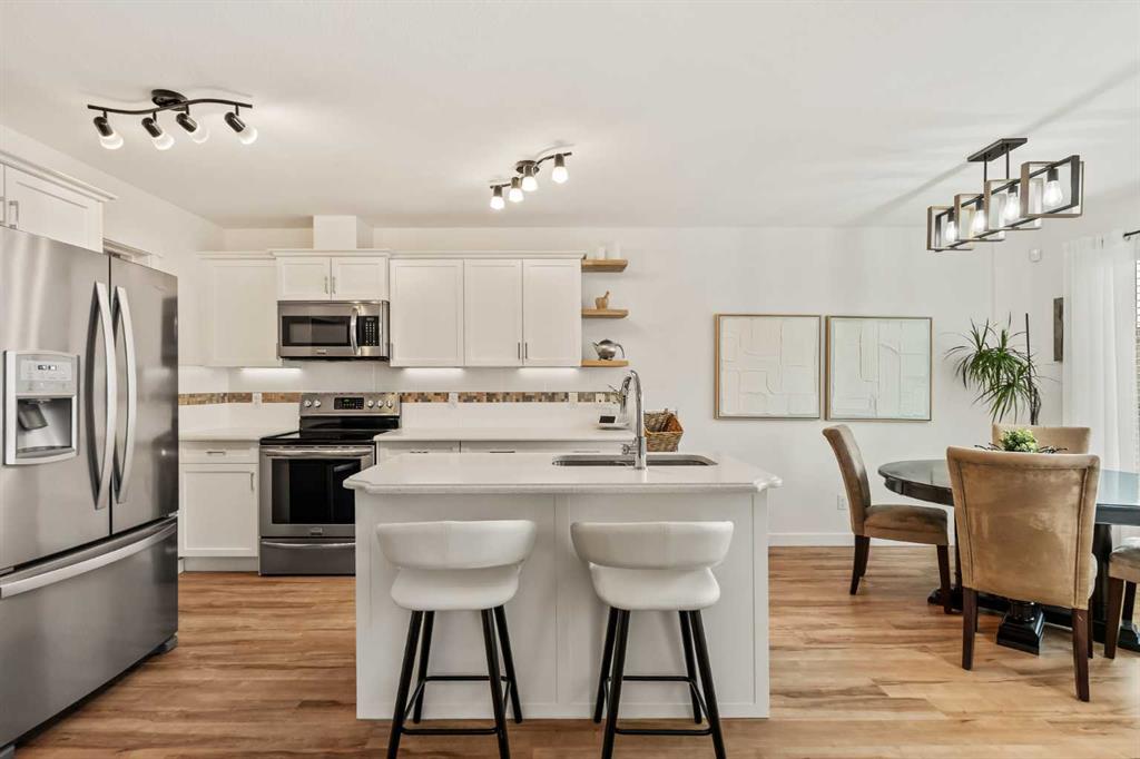Beautifully renovated with timeless style and a thoughtful layout, this Kings Heights home enjoys one of the largest pie lots in the community backing directly onto a greenspace and pathway. A quaint front porch welcomes guests while offering a quiet spot to enjoy morning coffee. Inside, the open concept main floor combines function and elegance with a neutral colour palette, durable luxury vinyl plank flooring and abundant natural light. The kitchen inspires culinary creativity with crisp white cabinetry, stainless steel appliances, a centre island for casual meals, a walk-through pantry for easy grocery unloading and a coffee bar for everyday convenience. The adjacent dining area with designer lighting flows seamlessly into the inviting living room where a gas fireplace adds cozy ambience. A powder room with a stylish feature wall completes the level. Upstairs, the primary retreat impresses with generous proportions, a walk-in closet and a private 4 pc ensuite. Two additional bedrooms are both bright and spacious, paired with a 4 pc main bath. Laundry on this level adds everyday ease. The finished basement continues the home’s stylish design, offering a versatile rec room with space for both cozy family movie nights and lively game evenings. A well-appointed wet bar makes entertaining effortless and keeps snacks and drinks close at hand. Also on this level is a generously sized 4th bedroom creating a private retreat for guests, while the beautifully updated 4 pc bathroom showcases a floor to ceiling tile feature wall and modern fixtures that add spa-like sophistication. Outdoor living reaches new heights thanks to the massive pie-shaped yard. A 2-tiered deck provides space to unwind, dine al fresco and barbeque, while a separate firepit area invites long summer evenings under the stars. Lush landscaping, expansive lawn space for kids and pets to play, a storage shed and built-in irrigation further elevate this private outdoor escape. Completing the property is a front-attached garage with additional driveway parking. Unbeatably located in a family-friendly and highly walkable neighbourhood, this home is surrounded by schools, playgrounds, parks, fountains, pathways and even a timber amphitheatre. Shopping, dining and quick access to the QEII for commuting are only minutes away. This home blends lifestyle, comfort and location into one complete package!