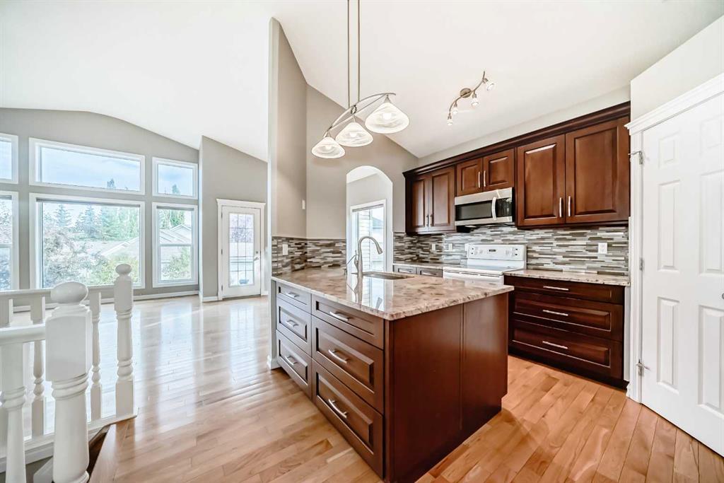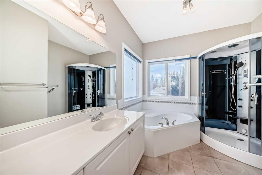 YOUR NEW HOME WHERE MEMORIES ARE MADE. Welcome to this beautifully maintained bungalow with 2,500 sq ft of living space, nestled in the vibrant and family-friendly community of West Springs, one of Calgary’s most sought-after neighborhoods known for its excellent schools, parks, and convenient amenities. Step inside to a bright, spacious tiled foyer that flows into an inviting open-concept main floor. Soaring vaulted ceilings, rich hardwood flooring, and large windows fill the space with natural light, creating a warm and welcoming atmosphere. The chef’s kitchen features elegant granite countertops—perfect for casual family meals or entertaining guests. The main floor boasts a generous primary bedroom complete with a walk-in closet, a spa-like ensuite featuring a standing shower and multi-jet soaker tub. An additional room on the main level offers flexibility as a cozy guest bedroom or home office, along with a convenient 2-piece powder room and main floor laundry. The fully finished basement adds even more living space with a large family room centered around a cozy wood-burning fireplace, two oversized bedrooms, and a full bathroom—ideal for teens, guests, or extended family. Step outside, enjoy the privacy of a low-maintenance vinyl fence surrounding a massive pie-shaped lot. The backyard is a true oasis with a multi-level deck, fruit trees, flowering perennials, and RV parking via the rear lane. It’s perfect for summer barbecues, kids’ playtime, or simply relaxing under the stars. Additional features include air conditioning, a water filtration system, garage shelving, and a no-pet, non-smoking history. This is more than a home—it’s a lifestyle. Book your private showing today!