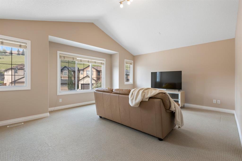 Upstairs, a generous bonus room with vaulted ceilings and oversized windows provides a great space for movie nights or a playroom. The upper level offers four bedrooms, including a spacious primary suite with peaceful views, a spa-inspired ensuite with dual sinks, soaker tub, separate shower, and walk-in closet, plus a full bathroom for the secondary bedrooms.