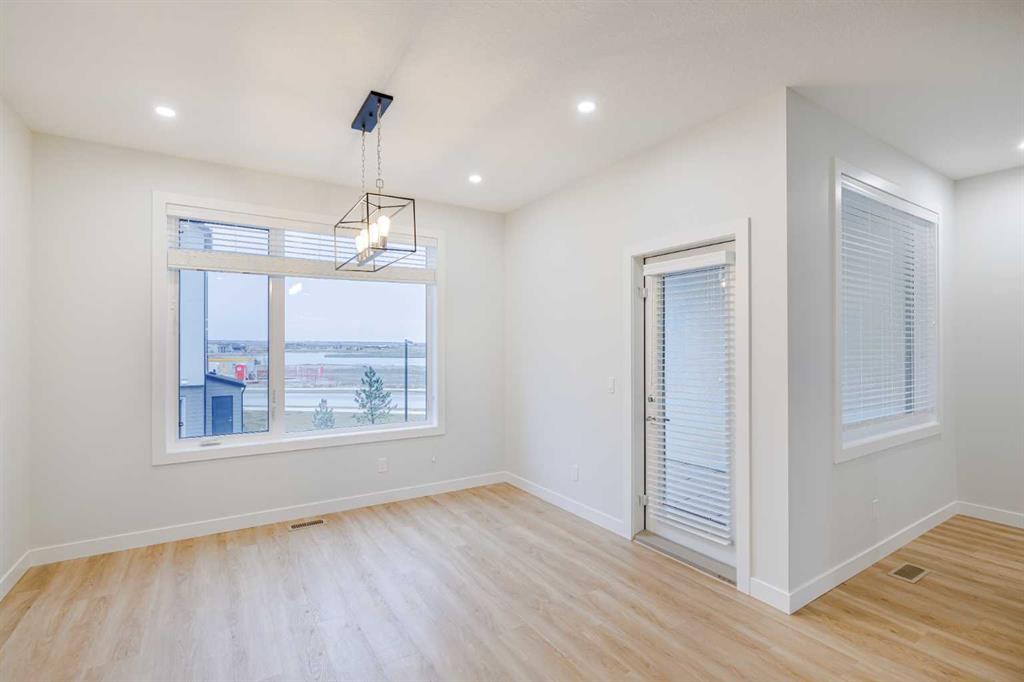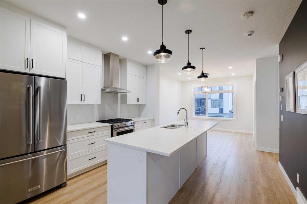 Welcome to this exquisite townhome that epitomizes the perfect blend of luxury, functionality, and natural beauty. Nestled in Harmony—an award-winning community that has proudly earned “Community of the Year – Calgary Region” eight times—this residence stands out with a plethora of upgrades, meticulous maintenance, and thoughtful design. Harmony offers an unmatched lifestyle, combining lake and golf living, walkable amenities, and stunning mountain views. As a resident, you’ll enjoy social membership at the renowned Mickelson National Golf Club, giving you access to world-class golfing right in your backyard. Families will appreciate the proximity to sought-after schools including Springbank Middle School, Springbank Community High School, and the prestigious Edge School for athletes and academics. As you step inside, you are greeted by a spacious den off the front entrance, just steps from the oversized double-car garage featuring a forward-thinking 40-amp EV connection, a true testament to modern living. Ascending to the main level, the kitchen immediately captivates with its elegant finishes—quartz countertops, a large island with breakfast bar seating, ceiling-height white cabinetry, and upgraded stainless steel appliances including a gas range for the culinary enthusiast. A massive pantry with extensive shelving ensures optimal organization. Adjacent to the kitchen is a charming eating nook with access to the front deck, where you can enjoy peaceful lake views. The sunlit living room offers a bright and inviting atmosphere, with panoramic mountain vistas framed by large windows, and a stylish fireplace with custom tile surround adding warmth and sophistication. The upper level showcases the primary suite, complete with a custom California Closet system and a spa-like ensuite featuring in-floor heating, a private water closet, standalone shower, and dual vanity. An upgraded laundry area with quartz countertop, additional shelving, and a large linen closet adds convenience. Two additional generously sized bedrooms and a 4-piece bathroom complete this floor. Outside of the home, Harmony’s amenities enrich everyday living—a 5-minute drive to Calaway Park, and the upcoming Bingham Crossing development with a future Costco and numerous shops and services. Residents also enjoy walking access to the community lake, miles of pathways, and future commercial amenities including the Nordic Spa.