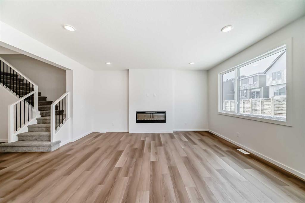 The main floor opens with a FLEX ROOM right off the foyer—ready to moonlight as an office, library, or the spot where backpacks go to disappear. The kitchen takes centre stage, anchored between the front and back of the home so everyday traffic moves without collision. It’s equipped with a 30" GAS COOKTOP, WALL OVEN, BUILT-IN MICROWAVE, and CHIMNEY HOOD FAN. QUARTZ COUNTERS, a SILGRANIT UNDERMOUNT SINK, and 50" UPPER CABINETS keep the look crisp and clutter-free, while the dining nook connects to an 11' × 10' REAR DECK through an upgraded three-panel patio door. The great room’s FIREPLACE FEATURE WALL pulls the whole main floor together—a little drama, a lot of comfort.