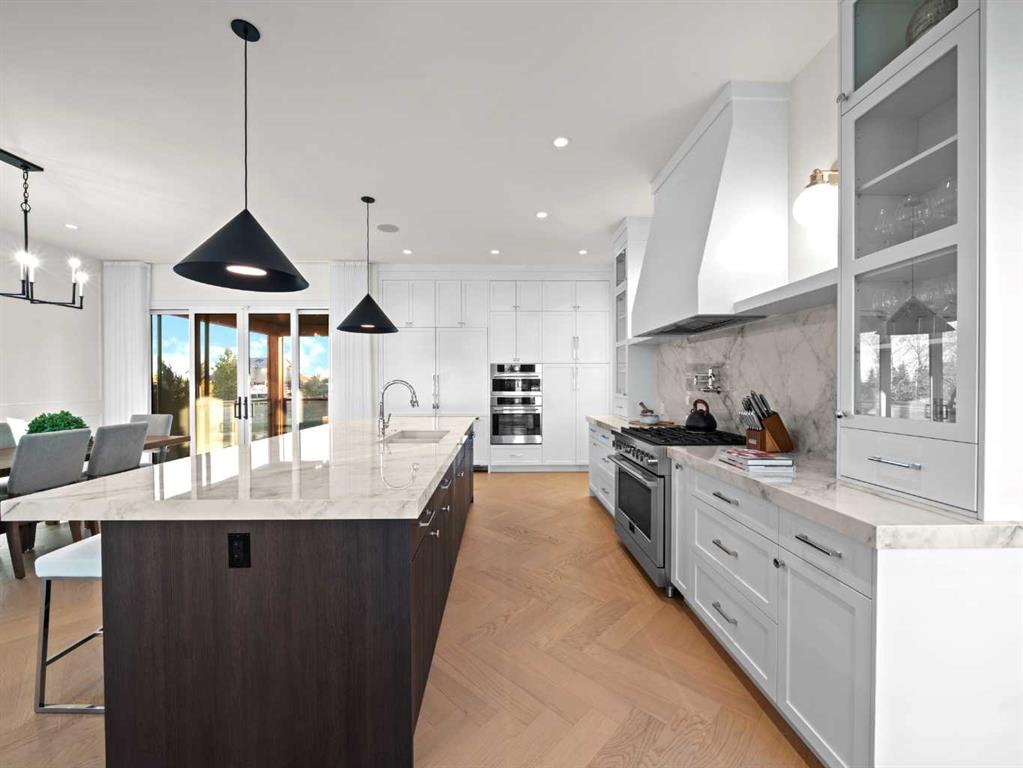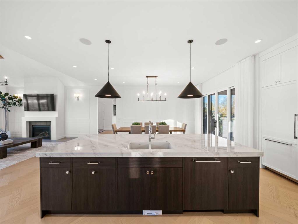 With over 5,500 sq. ft. of finished living space, this home was built with meticulous attention to detail. Step inside to discover a bright, open layout filled with natural light, soaring ceilings, and elegant arched doorways that bring classic charm into the modern design. The main living area features large picture windows with mountain views, a beautiful fireplace centrepiece, and seamless flow into the dining area and spacious terrace, perfect for entertaining or relaxing while enjoying the peaceful scenery.