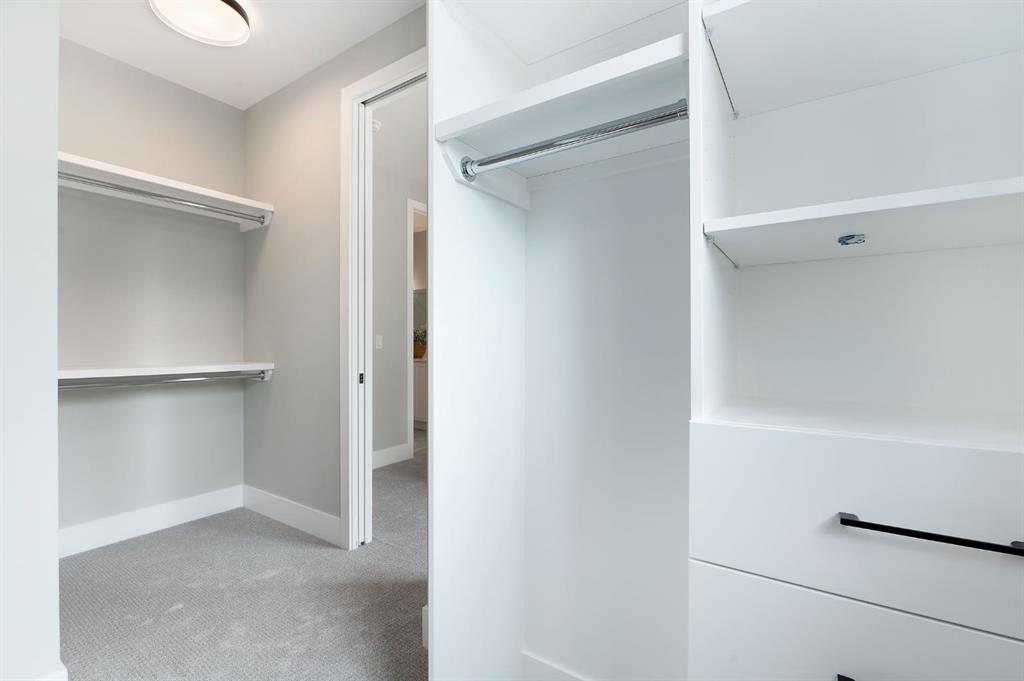 Upstairs, you’ll find two well-sized bedrooms. The primary suite is a tranquil retreat, complete with custom closet organizers and a spa-style ensuite with a double vanity and contemporary finishes. A second full bathroom with ensuite bathroom and a conveniently located laundry room complete this level.