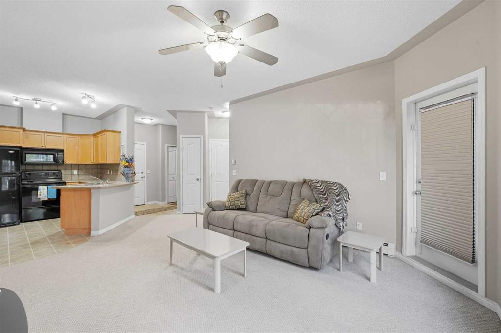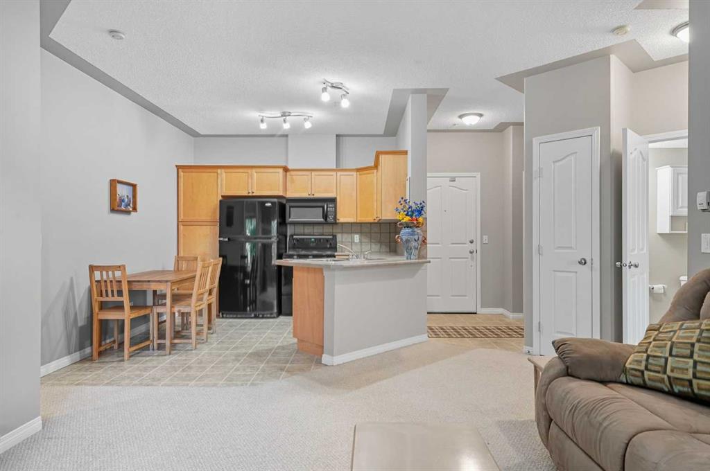 This immaculate condo is move-in ready and beautifully decorated in warm, neutral tones. The open floor plan features a spacious living area, bright dining space, and a functional kitchen complete with maple cabinetry, black appliances, and an over-the-range microwave.