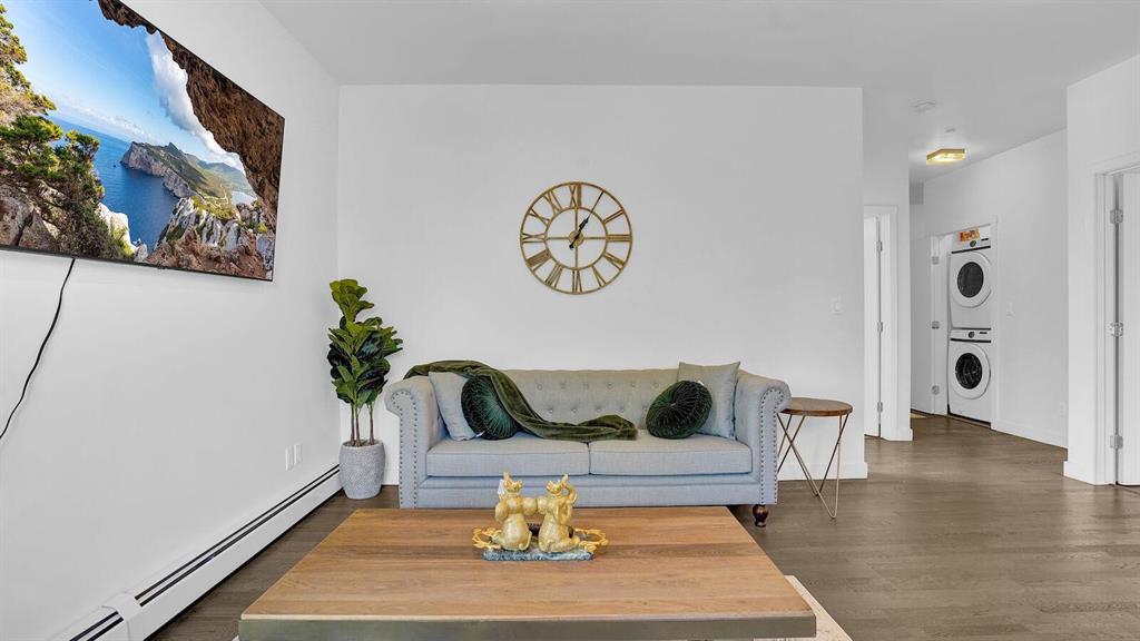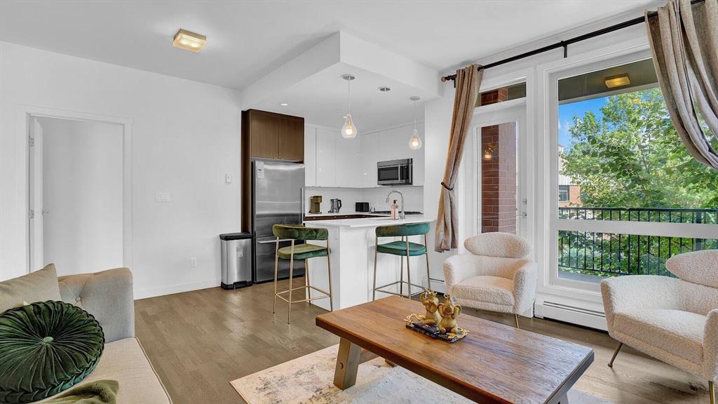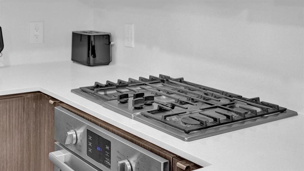 Introducing an exceptional real estate opportunity. Welcome to this stunning 2 bed/2 bath downtown view condo, complete with underground parking and storage. This unit offers an amazing layout and is equipped with all the builder upgrades, making it arguably the best in the building. As you enter, you'll be captivated by high ceilings and double stacked windows, creating a bright and spacious atmosphere. The open floor- plan is thoughtfully designed to maximize space and comfort, providing an executive feel. Large primary bedroom, unit has breathtaking downtown views and features a walk-through closet leading to a spa-inspired en-suite bathroom. The second bedroom and bathroom are conveniently separated by the open concept living area, ensuring privacy and functionality. This unit offers a range of impressive features, including engineered hardwood floors, quartz counters, a gas range, undermount lighting in the bathrooms, air-conditioning, and in-suite laundry. Enjoy the outdoors from the corner balcony with a gas line for your barbecue. Located in a well-managed and pet-friendly building, this condo is situated in one of the most vibrant areas of the city. With the river, numerous restaurants, nightlife, and shopping on 17 Ave just steps away, you'll experience the finest in inner-city living.