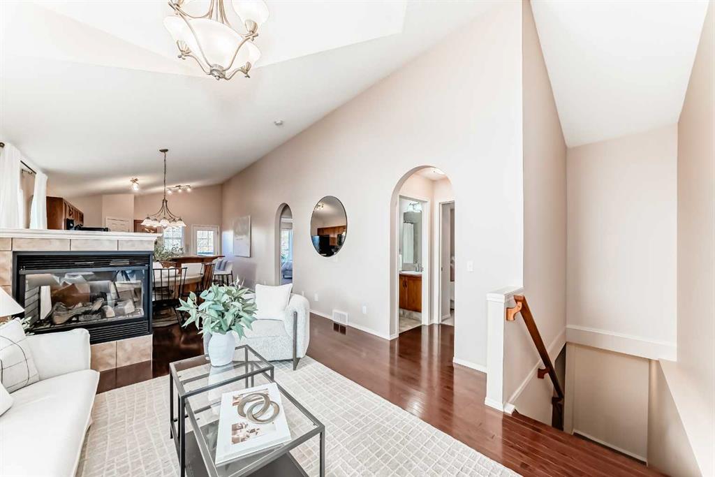 Hello Gorgeous! Welcome home to this beautifully maintained 3 bedroom, 3 bathroom property offering over 1943 sq. ft. of fully developed living space. From the moment you step inside, you’ll love the bright, welcoming atmosphere, highlighted by vaulted ceilings, hardwood floors, and an open-concept main floor designed for modern living. The inviting living room features a three-sided gas fireplace, creating a cozy ambiance that connects seamlessly to the kitchen and dining areas. The spacious primary bedroom offers a walk-in closet and four-piece ensuite, while a generous flex room on the main floor provides the perfect space for a home office, guest suite, or creative studio — the possibilities are endless! Downstairs, the fully finished basement expands your living space with a large recreation area, second gas fireplace, additional bedroom, full bathroom, laundry room, and ample storage. Step outside to your private backyard oasis with a freshly stained, two-tier deck — perfect for entertaining, barbecues, or simply relaxing. Additional features include air conditioning for year-round comfort. Nestled on a quiet, family-friendly street, this home is ideally located close to schools, parks, shopping, and Airdrie’s extensive walking path system. This home truly has it all — space, comfort, and a welcoming charm you’ll feel the moment you walk in.