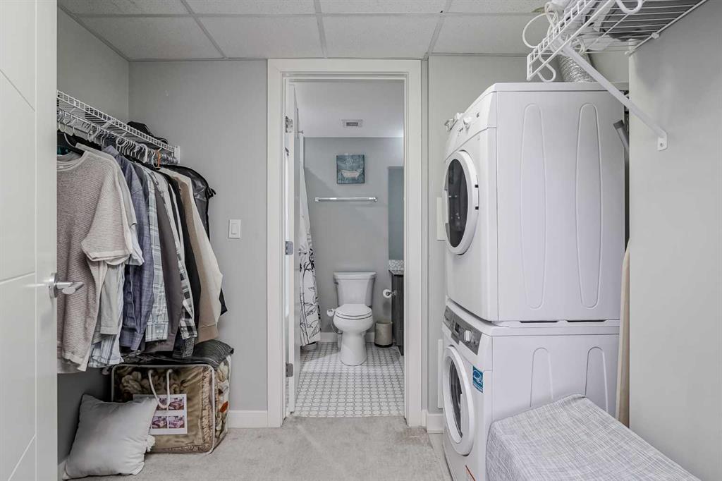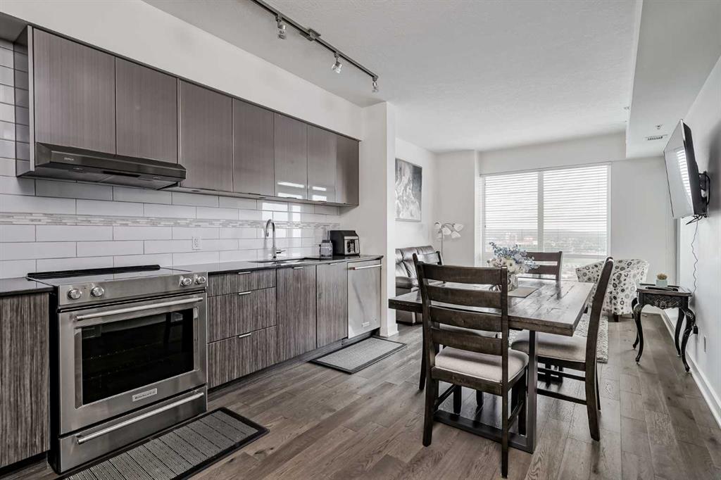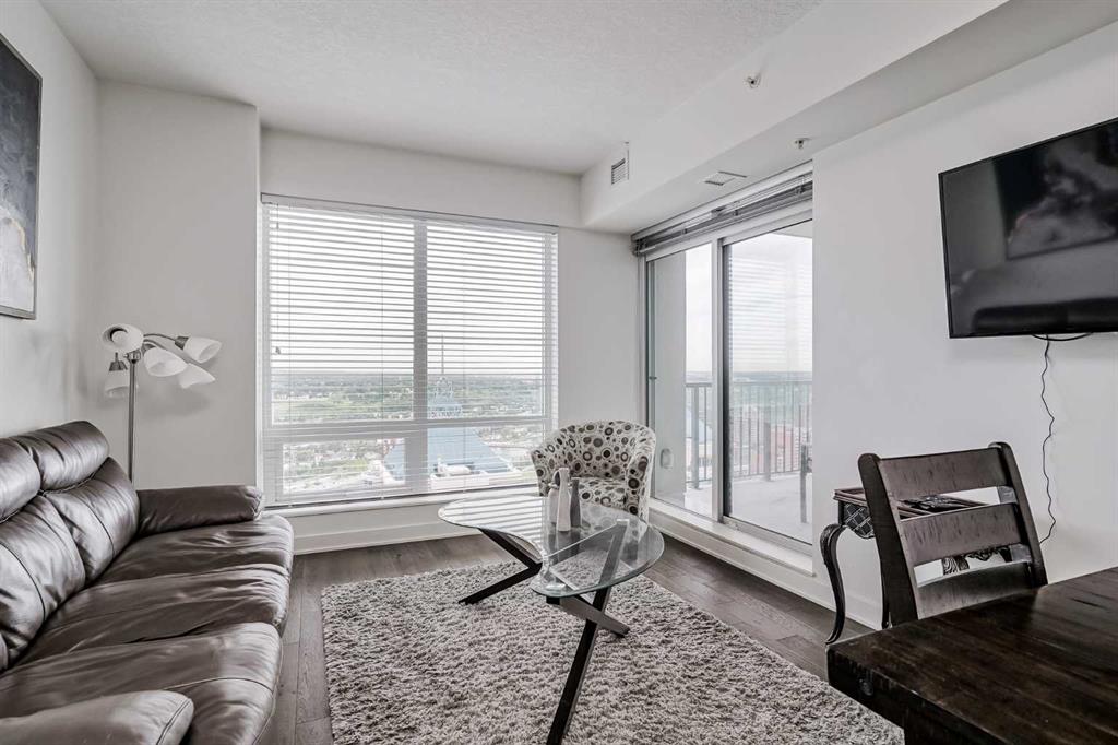 Welcome to this stunning, 1 bedroom, 1 bathroom home on the 33rd floor of one of Calgary's most sought after buildings, Vogue! If you have ever wondered what the downtown skyline and Bow River look like from 33 stories above the ground, this is the unit for you! As you walk in you are greeted with gorgeous dark wood floors, starting with a flex area that is great for an office space or additional storage. The open floor plan features a large kitchen with quartz counter tops, stainless steel appliances, a ton of cabinets and drawers and allows for an eat in kitchen experience. The dining area flows into your living room with floor to ceiling windows giving you UNOBSTRUCTED VIEWS OF THE BOW RIVER as well as MOUNTAIN VIEWS from the balcony. The balcony is a good size and offers great outdoor space. The bedroom is large enough for all of your bedroom furniture and features a walk through closet with in unit laundry and direct access to your full bathroom. The Drake is truly one of Calgary's gems of a building giving luxury hotel vibes, bicycle storage, fitness centre, recreation room, roof deck, and secured parking. This unit has a titled underground parking stall and assigned storage locker. This building is in a great location with being steps from the riverwalk, shops, cafe's, restaurants, parks, pathways and transit. Do not miss out on this opportunity to own one of the highest units with river views in the entire city.