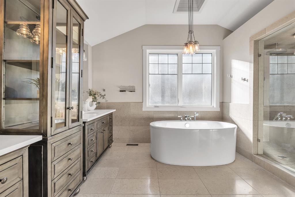 The fully developed lower level enhances the home’s entertaining appeal, offering heated concrete floors, a glass-enclosed wine cellar, a wet bar, and an expansive recreation area. A private living quarters with kitchen, laundry, and full bath provides private accommodation for a nanny, extended family, or guests.
