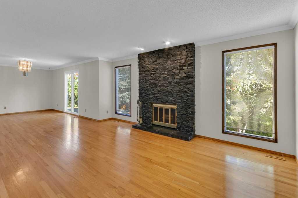 The bright and inviting living room showcases a stunning stone feature fireplace, while the formal dining room flows seamlessly onto an oversized deck – great for outdoor gatherings.