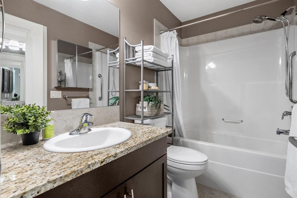The four-piece bathroom impresses with its granite vanity and dual access from both the hallway and the bedroom.