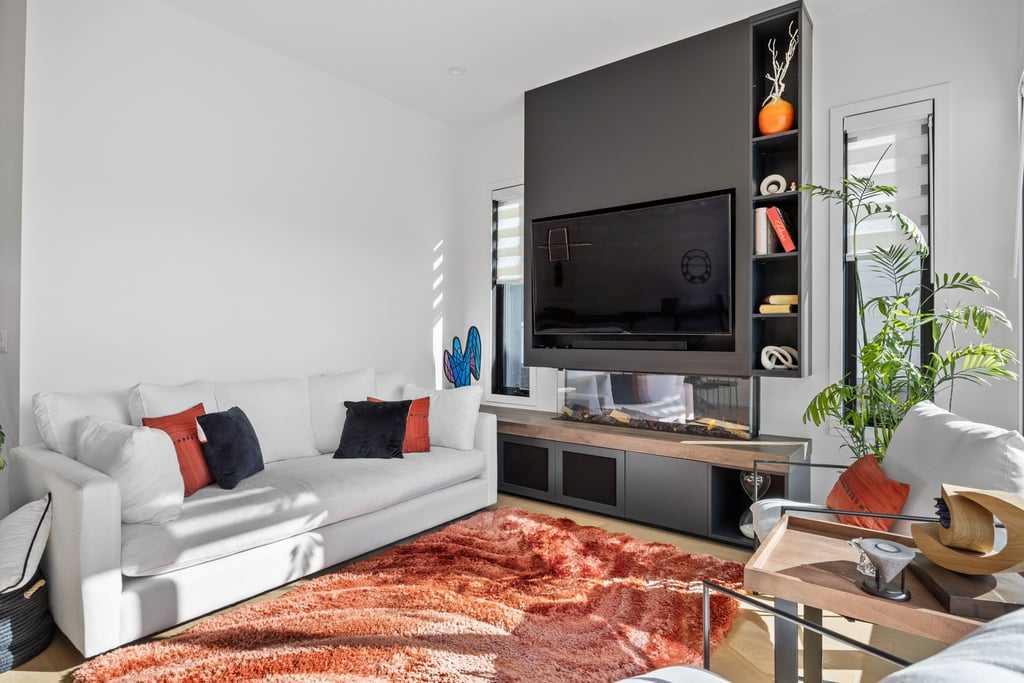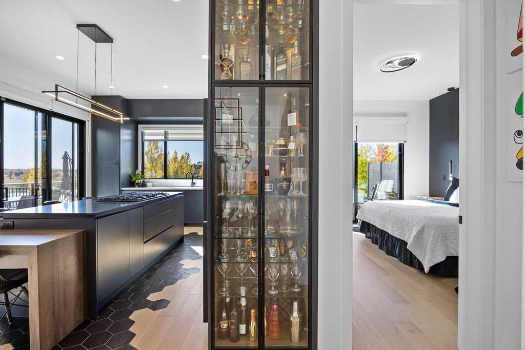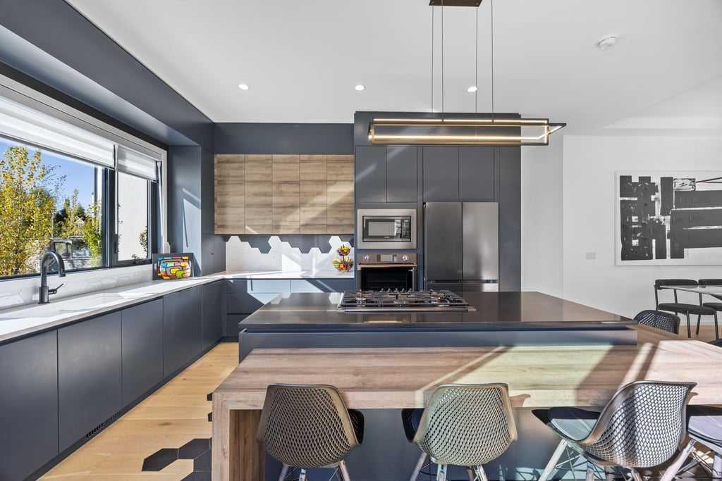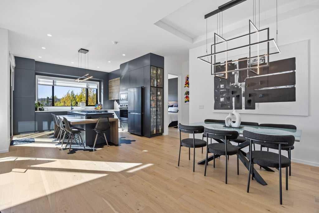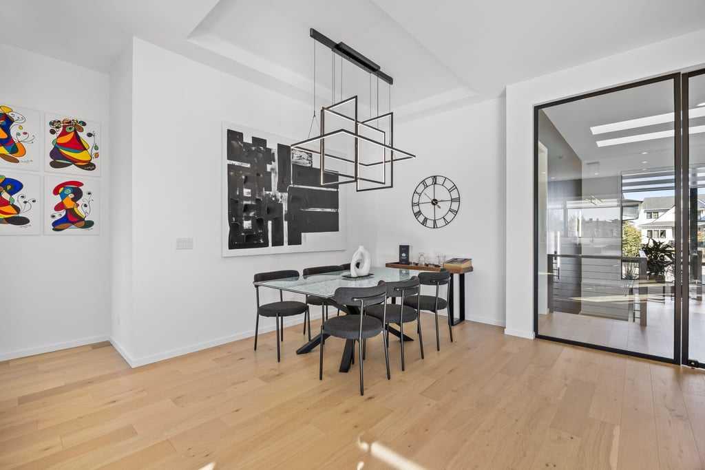 Inside, every detail reflects thoughtful craftsmanship. The gourmet kitchen features sleek custom cabinetry, quartz countertops, and premium built-in appliances, all designed to inspire culinary creativity. High ceilings and oversized windows fill the home with natural light, creating an airy, inviting atmosphere.