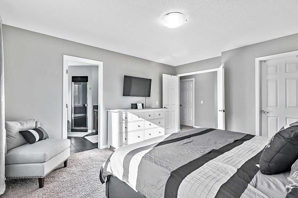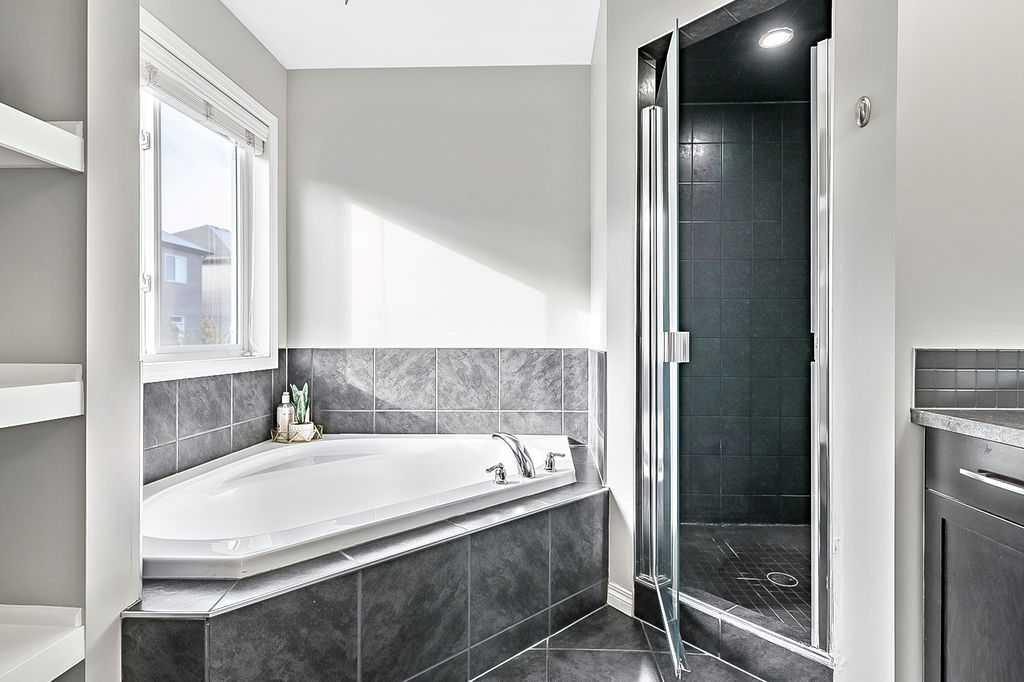 The upper level boasts three spacious bedrooms, two of which include unique sitting areas that overlook the expansive park, providing a serene and private retreat. The primary bedroom has ample room and includes an elegant ensuite with a corner soaker tub, a full tile shower, and a large vanity designed for comfort and luxury.