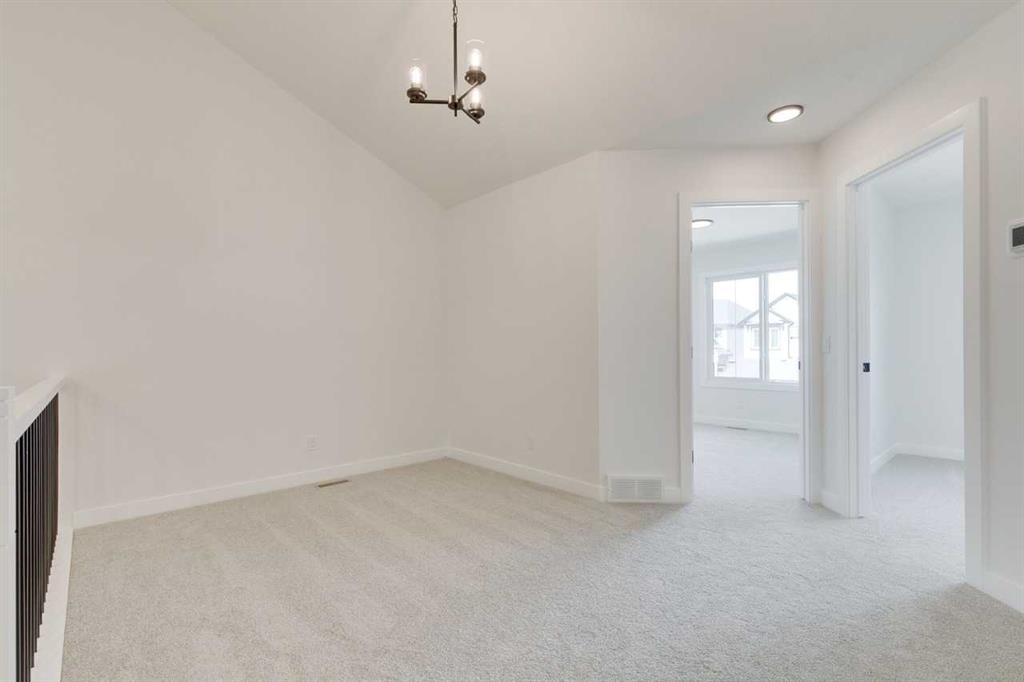 The kitchen is equipped with built-in stainless steel appliances, quartz countertops with a waterfall-edge island, and a walk-in pantry. The main floor includes a versatile den and a side entrance. Upstairs, enjoy a spacious loft with vaulted ceiling and an electric fireplace for added comfort. The primary ensuite offers a tiled walk-in shower and a vanity with full-height drawers, while LVP flooring adds durability throughout the bathrooms and laundry area. Home also features a 11' x 11' rear deck.