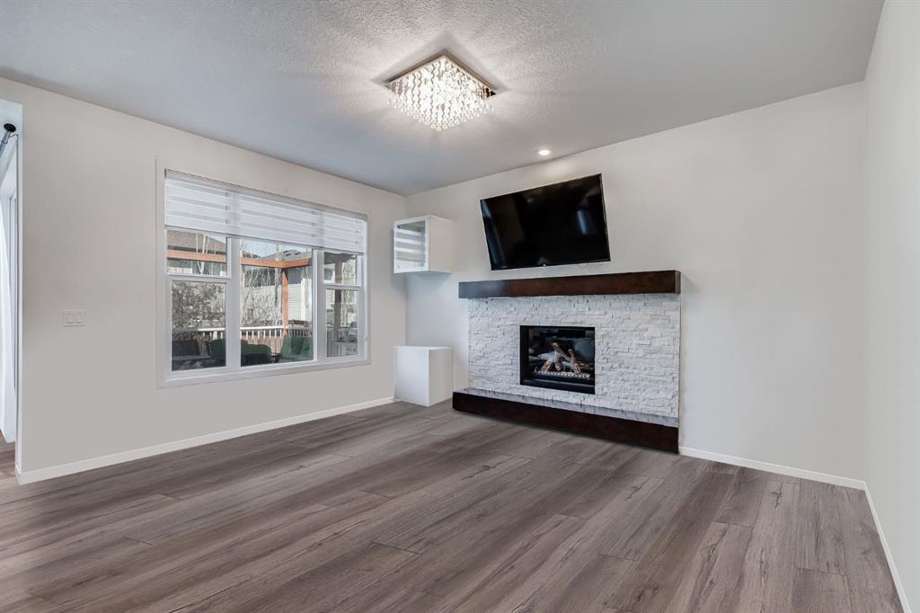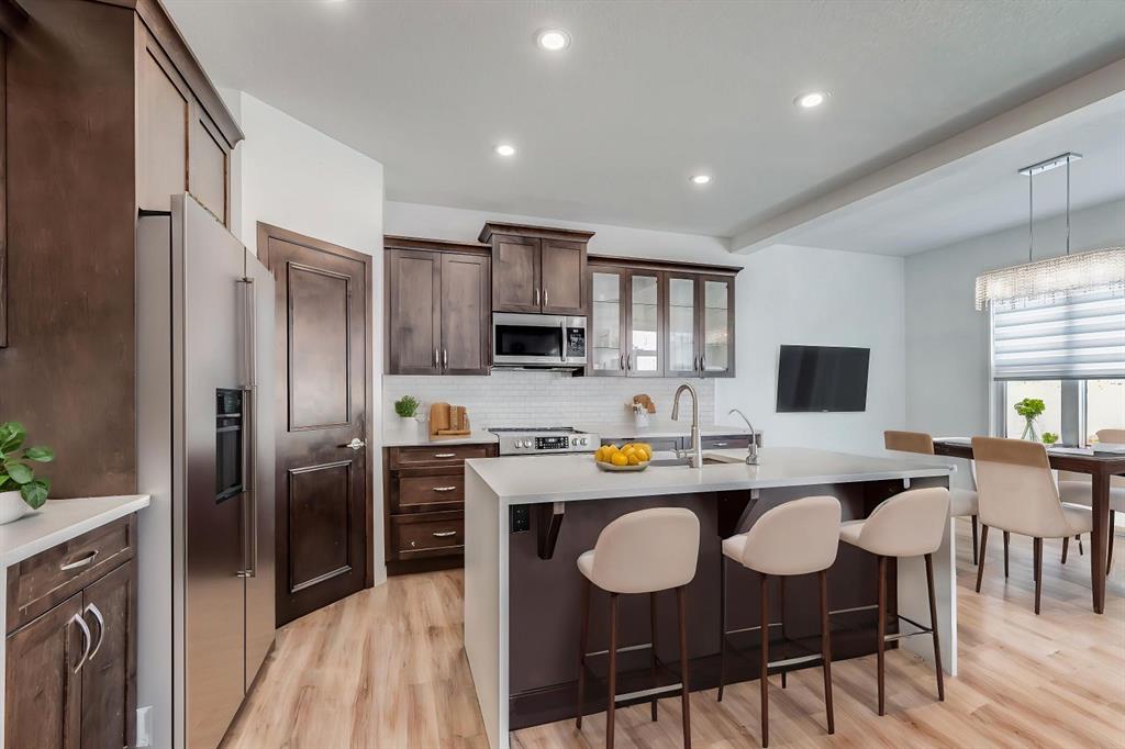 Step inside to a bright, open-concept main floor where luxury vinyl plank flooring runs wall-to-wall — no carpet in sight. The chef-inspired kitchen is the heart of the home, featuring a dramatic white quartz waterfall island, full stainless steel appliance package, rich espresso cabinetry, tiled backsplash, and a corner pantry. The adjacent dining area and inviting great room, anchored by a stone-wrapped gas fireplace, offer the ideal setting for entertaining or everyday family living. A private main floor den, built-in mudroom lockers, and a stylish 2-piece bath complete the level.