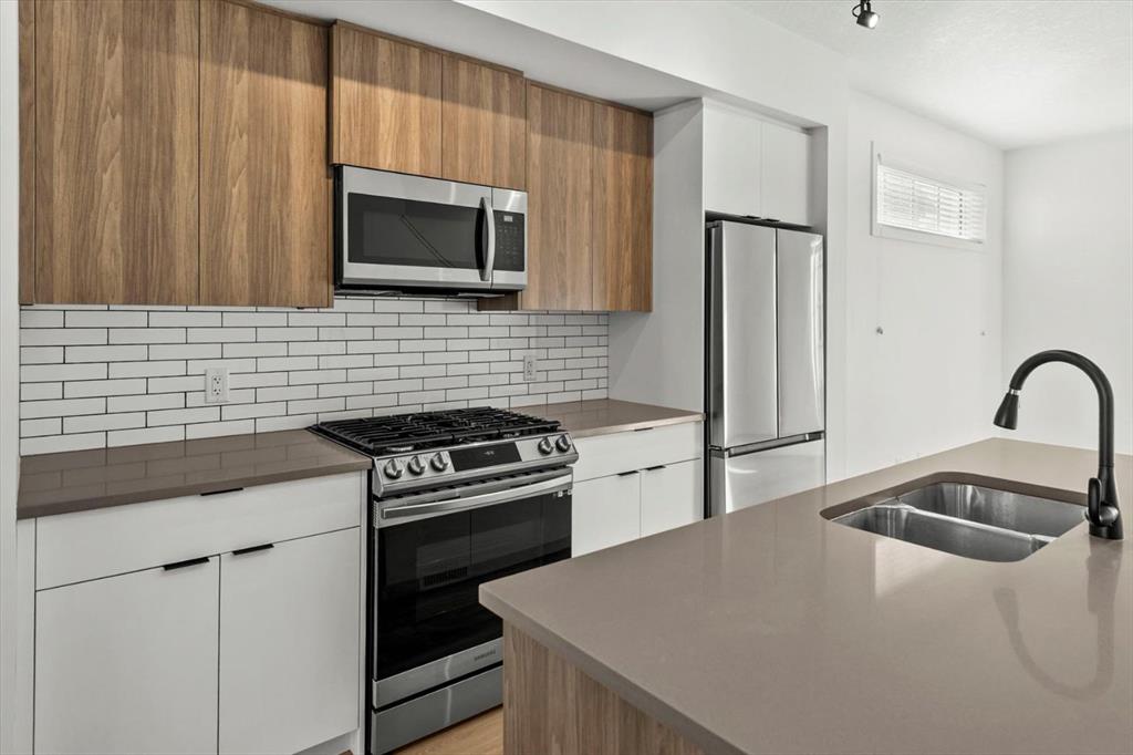 Are you looking for bright, air-conditioned open concept living? What about with a convenient location near Township Shopping Center with easy access to Macleod Trail and Stoney Trail. The original owner of this home, it has been lovingly maintained and is pet/smoke free. Set along the courtyard, this townhome has a tandem double attached garage. On the main floor, the open concept layout is elevated by 9’ ceilings, durable LVP flooring and modern finishings. The two-tone kitchen offers a large island, and is finished with grey quartz counters and upgraded stainless steel appliances – including a gas range. South sunshine floods into the dining area - which is separate from the kitchen and overlooks the courtyard. The living room has a media nook and leads out to your balcony. Perfect for grilling, chilling and making the most of summer nights. This level is complete with a private powder room just before heading upstairs. On the top level, the airy owners retreat features natural light and a modern 3 piece ensuite. This level also offers 2 additional bedrooms, another 4 piece bathroom and convenient laundry. This is a great starter home, or for downsizing folks who are done taking care of the yard and want a lock and go lifestyle. Contact your trusted agent to book a showing before She Gon’!