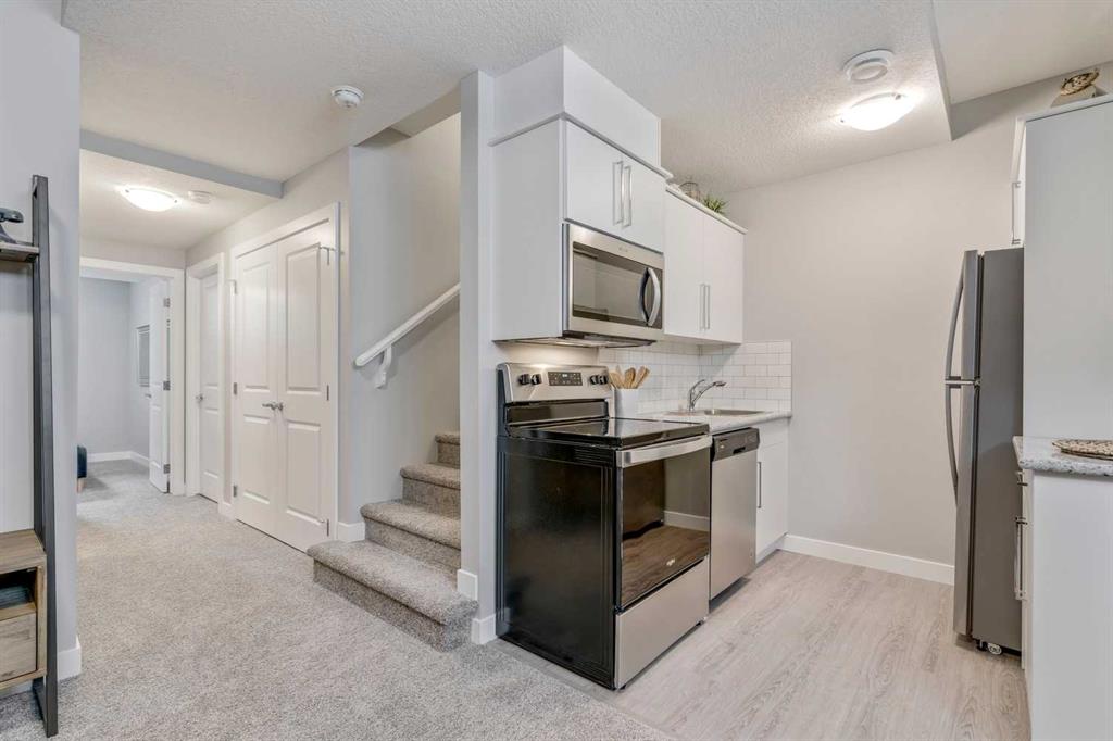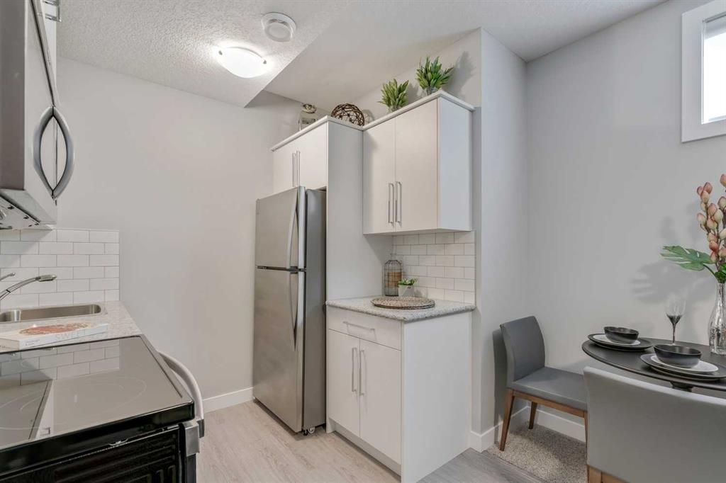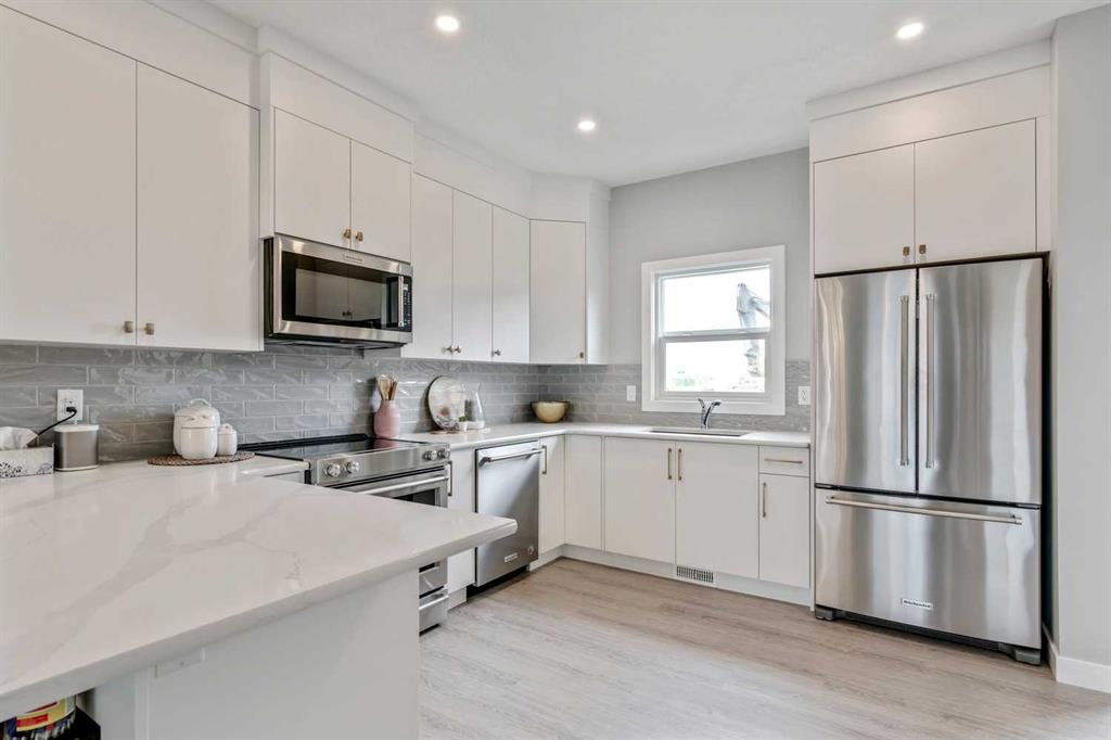 This beautifully designed show home features a double detached garage and welcoming front porch, complemented by 9’ knockdown ceilings throughout the main level. The front lifestyle room offers a spacious area to relax, while a dual-door closet provides ample storage. The center dining area flows effortlessly into the rear kitchen, which boasts stainless steel appliances including a slide-in stove, over-the-range microwave, French door refrigerator, and dishwasher, all enhanced by soft-close cabinetry, quartz countertops, and a stylish tiled backsplash with added upper soffit filler. A dual-door pantry and rear entry with a coat closet add convenience, along with a 2-piece bath on the main floor. Upstairs, plush carpeting covers the hall and two front bedrooms, while the rear primary suite features vinyl plank flooring in the 4-piece bath, complete with a quartz storage vanity, tub surround with decorative tile accents, and direct access to a spacious walk-in closet. The upper laundry area includes a washer, dryer, and additional upper cabinets for storage. A second vinyl plank 4-piece bath with quartz vanity and tiled tub surround serves the upper level, alongside an upper linen closet. The finished legal basement suite with a separate side entry offers comfortable living with carpeted floors and knockdown ceilings. It includes a common area leading to the utility room, a stacked laundry closet with full-size washer and dryer, and a vinyl plank 3-piece bath featuring a separate shower, quartz storage vanity, and tile accents. The suite’s kitchen is equipped with vinyl flooring, upper and lower cabinets, stainless steel fridge, smooth-top stove, dishwasher, quartz counters, tiled backsplash, and over-the-range microwave. A rear bedroom with closet completes this self-contained living space. Not just a home but a smart investment with a legal suite and double detached garage!