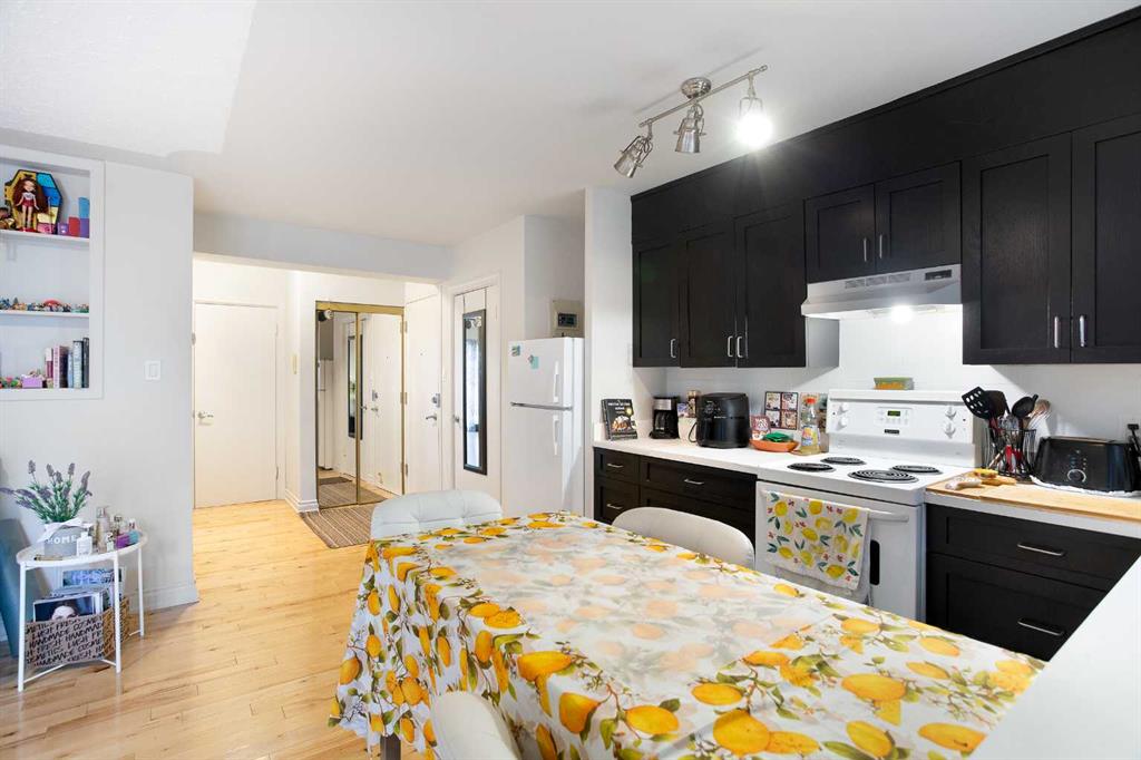 OPEN HOUSE SATURDAY NOV 1 1 PM-3 PM. Enjoy modern city living in this stylish and sunlit 1-bedroom condo, featuring hardwood floors, a modern updated kitchen, and newer vinyl windows. The open-concept layout flows to a private balcony with beautiful views, and includes shared off-street parking—all in one of Calgary's most desirable inner-city neighborhoods. Walk to everything downtown has to offer. Safeway, Co-op, community Natural Food market, cafes, restaurants and transit are all just a short walk away.