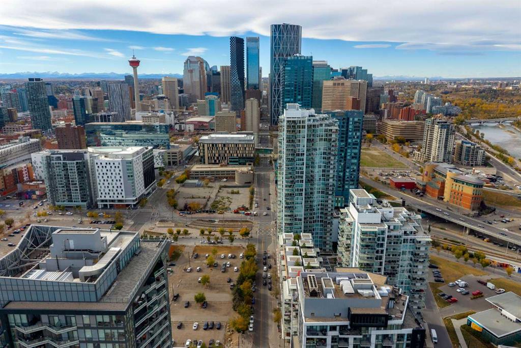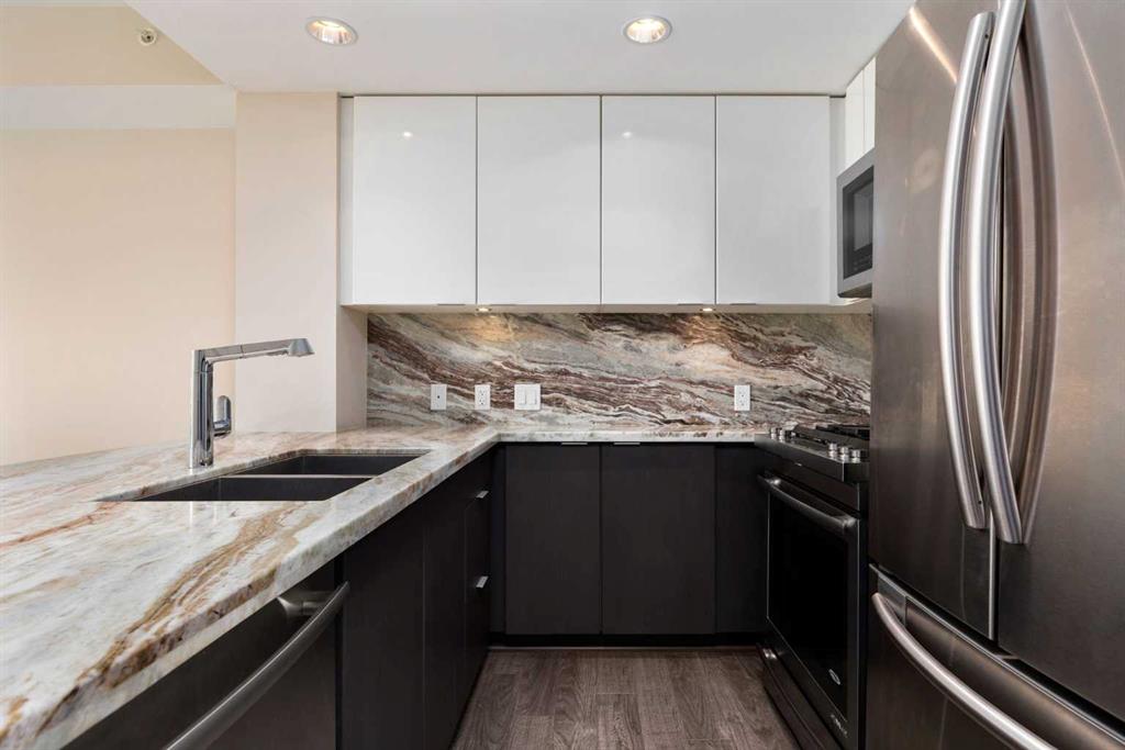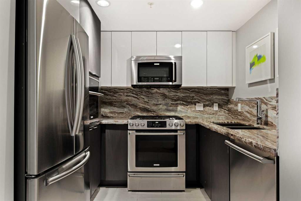 This 2-bedroom + den, 2-bath condo features a bright, open-concept layout with floor-to-ceiling windows and city skyline views from your balcony. The modern kitchen offers high-end stainless-steel appliances, granite countertops and backsplash, ample cabinetry, and a large breakfast bar—perfect for entertaining.