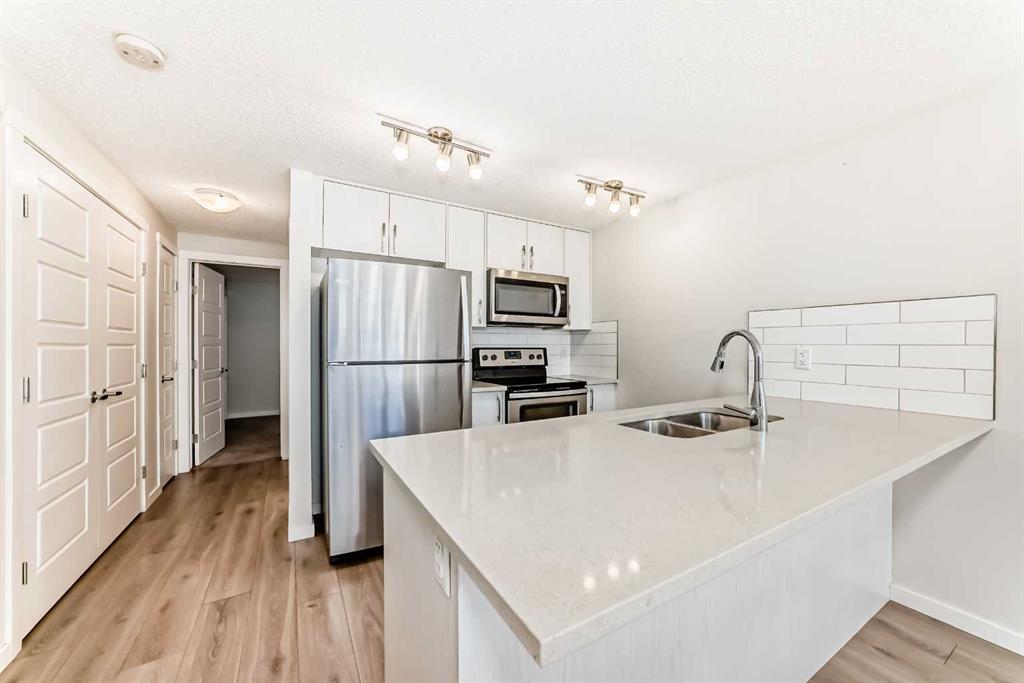 VALUE VALUE VALUE! $111.41 condo fee! This modern Riverstone home in Cranston offers an open-concept layout with upscale finishes, including stainless steel appliances, quartz counters, and a subway tile backsplash. Steps from the Bow River, trails, and green spaces, it features a large primary bedroom with dual closets, a 4-piece bath, in-suite laundry, extra storage, a fenced patio, and a dedicated parking stall. Pet-friendly (board approval) and conveniently close to amenities, this property combines natural surroundings with urban comfort at a low monthly condo fee.