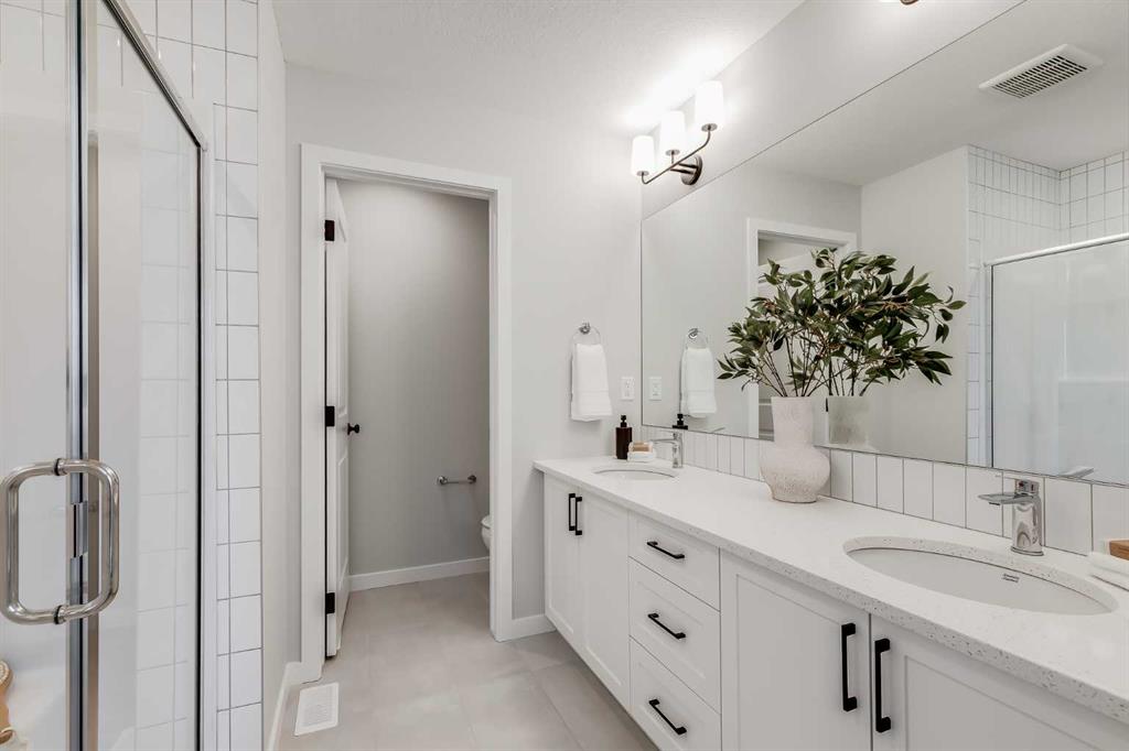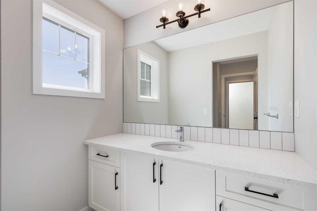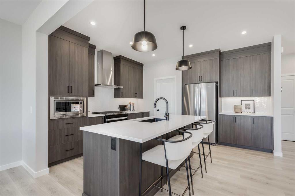 Crafted by Baywest Homes, a trusted builder since 1985, this home showcases quality construction, thoughtful design, and the peace of mind that comes with both a 10-Year Alberta New Home Warranty and a one-year builder warranty. Step inside to a warm, welcoming entryway that opens into the heart of the home—the showstopper kitchen. This chef-inspired space features 42-inch white cabinets reaching to the ceiling with crown molding and under-cabinet lighting, a built-in microwave, gas range, upgraded appliances, and a chimney hood fan with full-height tile. Quartz countertops, a Silgranite undermount sink, an upgraded faucet, and a stylish taupe island elevate both beauty and function. You’ll also appreciate the clever 4-bin pullout system for waste, recycling, and compost—keeping everything neat and hidden. A tucked-away powder room sits conveniently nearby for added everyday ease. Across from the island sits a spacious pantry, while the mudroom offers additional storage and a discreet spot for outerwear and shoes.