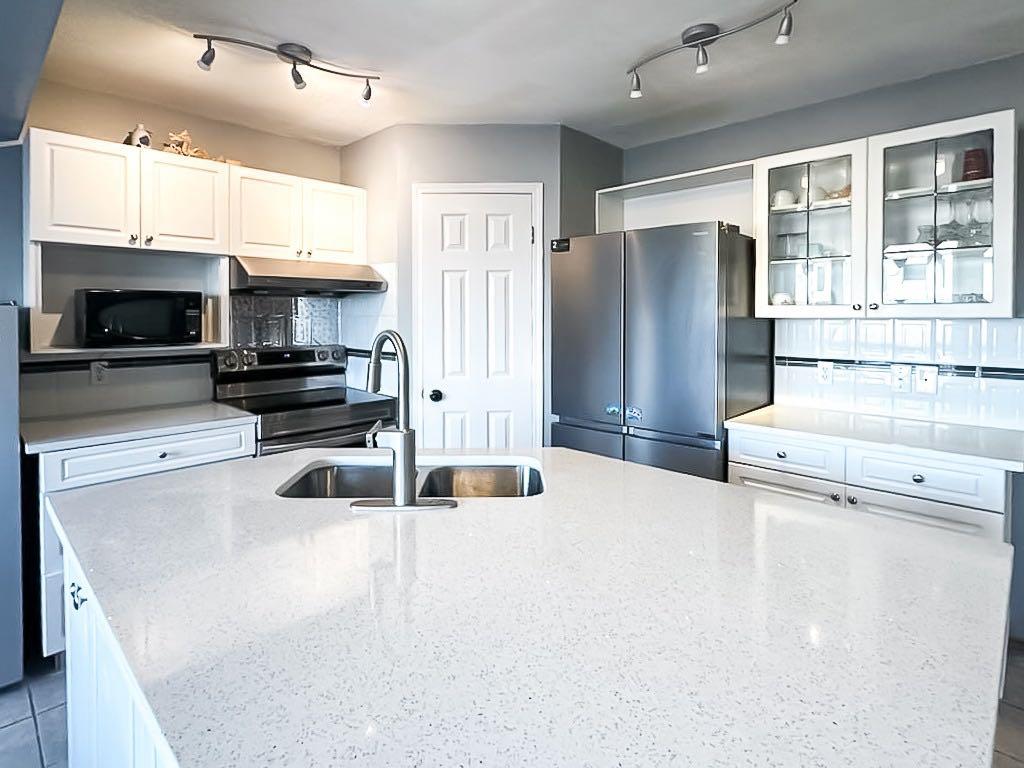 This beautifully updated 2-storey home offers exceptional versatility for family living, with breathtaking VIEWS from all three levels. The main floor showcases a large central island, BRAND-NEW quartz countertops and faucets, a BRAND-NEW hood fan and fridge, stainless steel appliances, and ready plug-ins for BOTH GAS AND ELECTRIC STOVE options. A bright office/bedroom on the main floor adds valuable flexibility for working from home or hosting guests.
