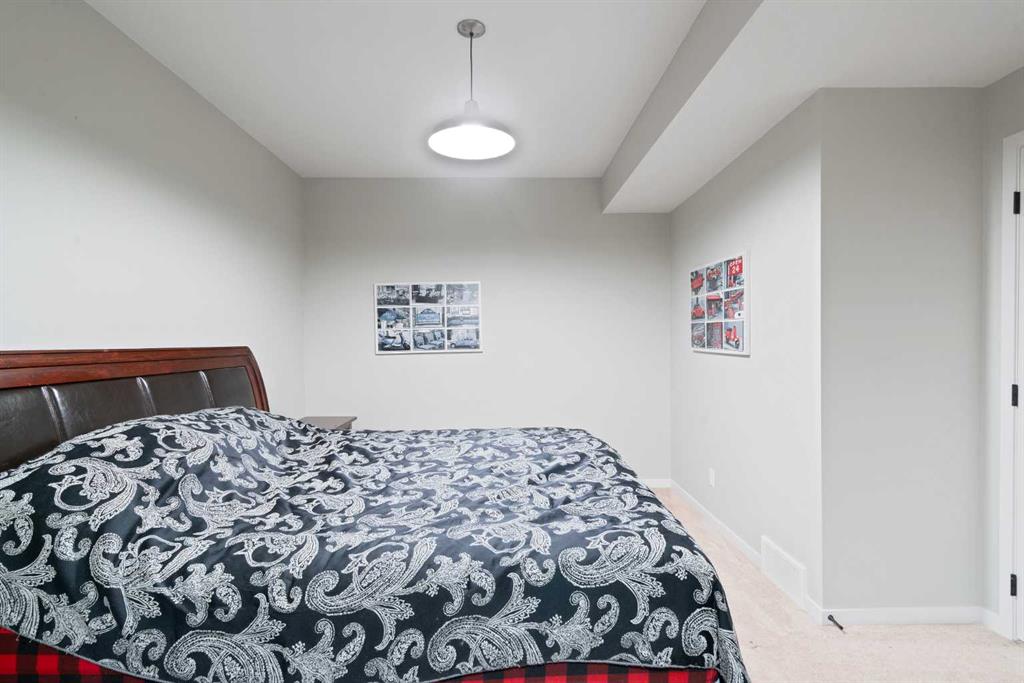 The fully finished lower level offers an impressive entertainment space with in-ceiling surround sound throughout the whole house, a three-piece bathroom, and a large bedroom that comfortably fits a king-sized bed, two oversized end tables, and more. An alcove area—currently set up as a music room—and a generous walk-in closet make this space both functional and inviting.