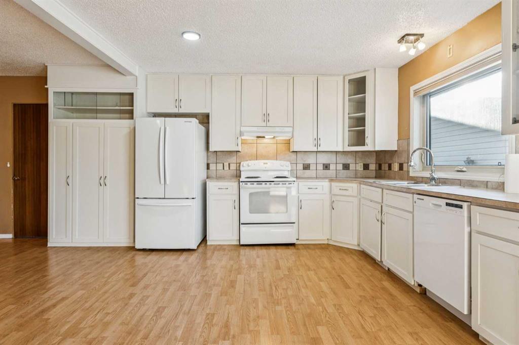 Significant updates enhance the home’s appeal, including new acrylic stucco and windows installed approximately 11 years ago, a newer roof (about 10 years old), and a recently replaced hot water tank. The exterior shines with a new vinyl fence, enclosing a large lot with 65’ of frontage (including 15’ of utility right-of-way) adorned with mature apple trees, perfect for outdoor enjoyment. The oversized 26’ x 24’ double garage, with 9’ ceilings, is insulated and heated, providing ample space for vehicles, storage, or a workshop.