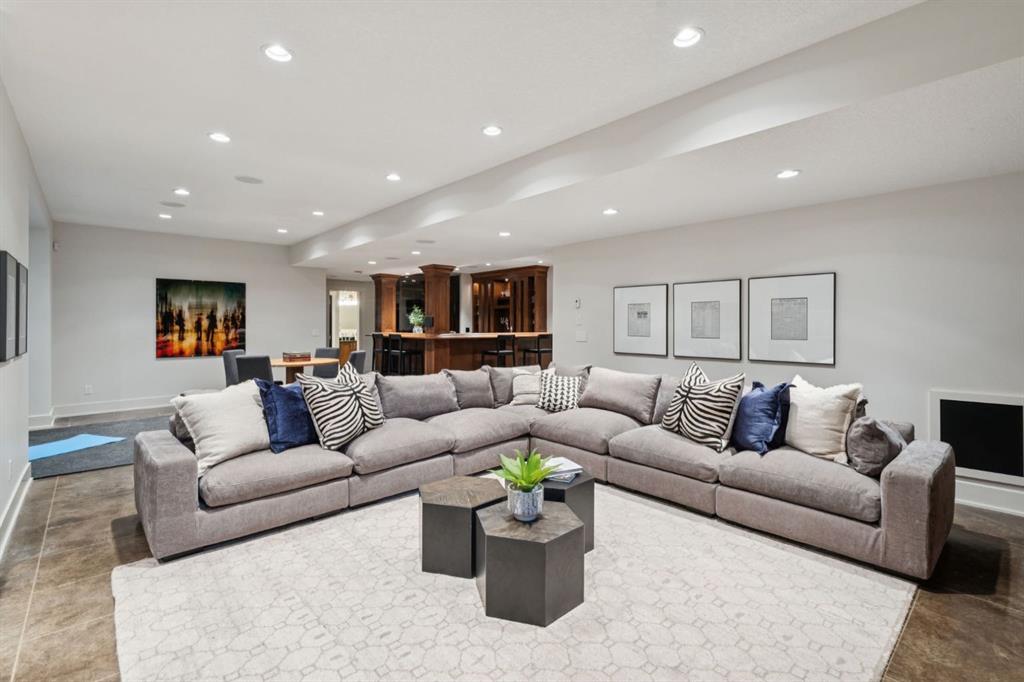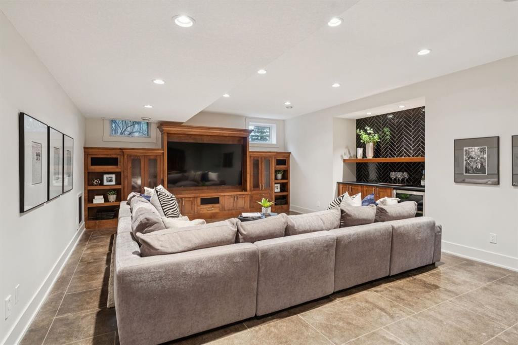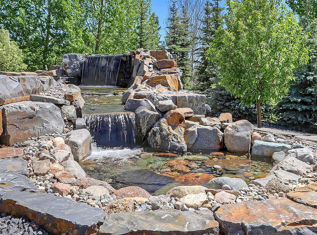 Outside, the property unfolds like a private park, an achievement of landscape architecture rarely seen at this scale. The Rocky Mountain inspired waterfall and meandering creek set a tranquil tone as they flow beside the expansive poured aggregate patio, surrounded by towering evergreens and deciduous trees, layered greenery, and meticulously crafted stonework. The result is a lush, immersive environment that feels alive in every season.