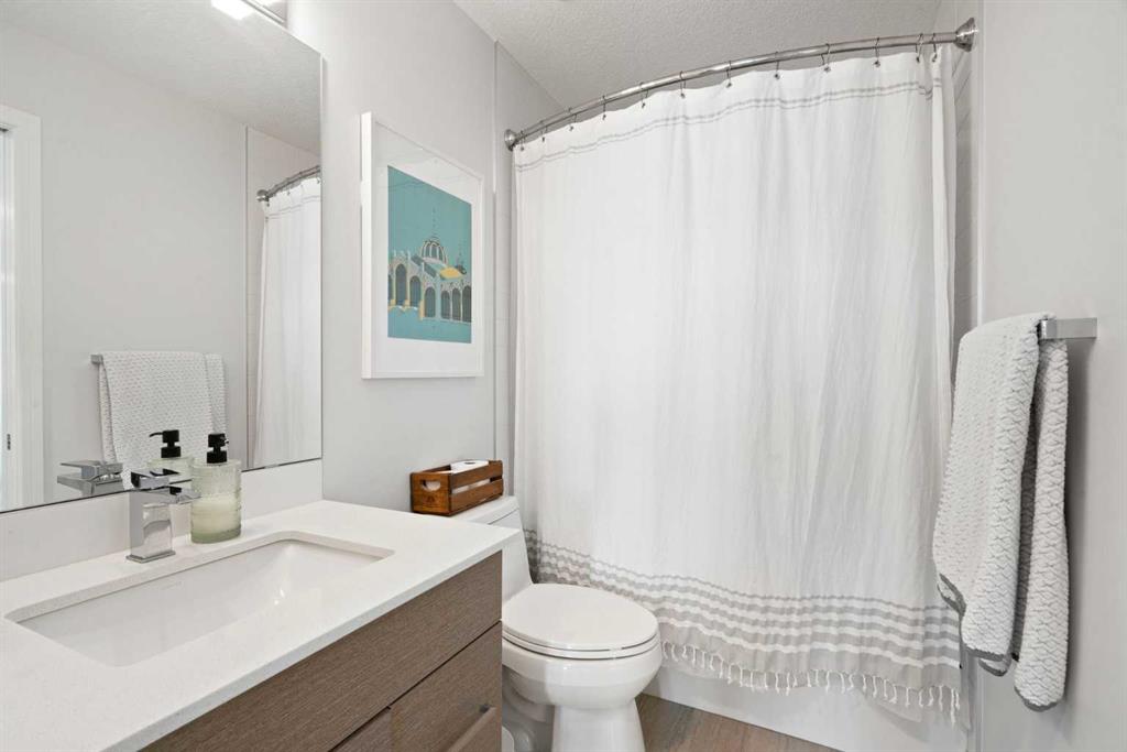 The open-concept layout features a contemporary kitchen with quartz countertops, stainless steel appliances, and ample cabinetry, seamlessly connecting to a spacious living area filled with natural light. The primary bedroom includes a walk-through closet and ensuite, while the second bedroom provides excellent flexibility for guests, a home office, or a roommate setup.