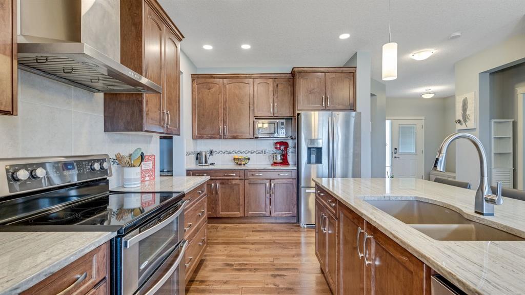 Step outside for direct access to the greenspace and walking paths, perfect for morning walks or evening play. The three-car garage offers generous storage, and the location is walking distance to schools, parks, and shopping, with quick access to Highway 2 for an easy Calgary commute.