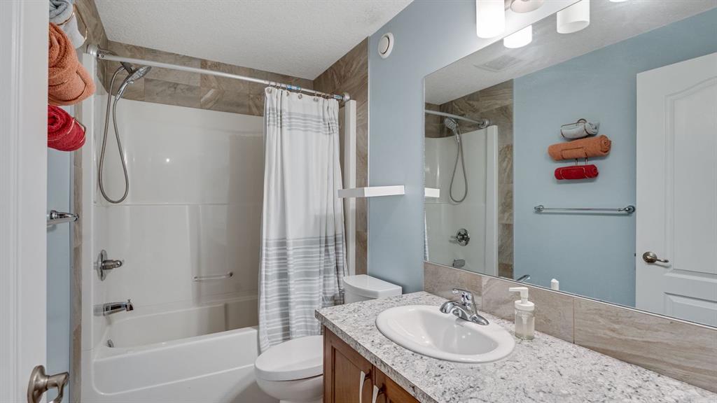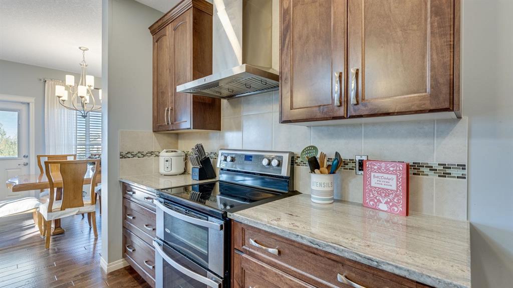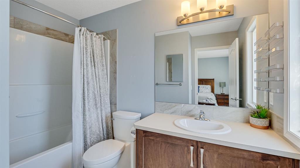 Upstairs, discover four spacious bedrooms, including two with ensuites. The primary suite offers panoramic views of Airdrie, a spa-inspired ensuite, and a custom walk-in closet with built-in shelving.