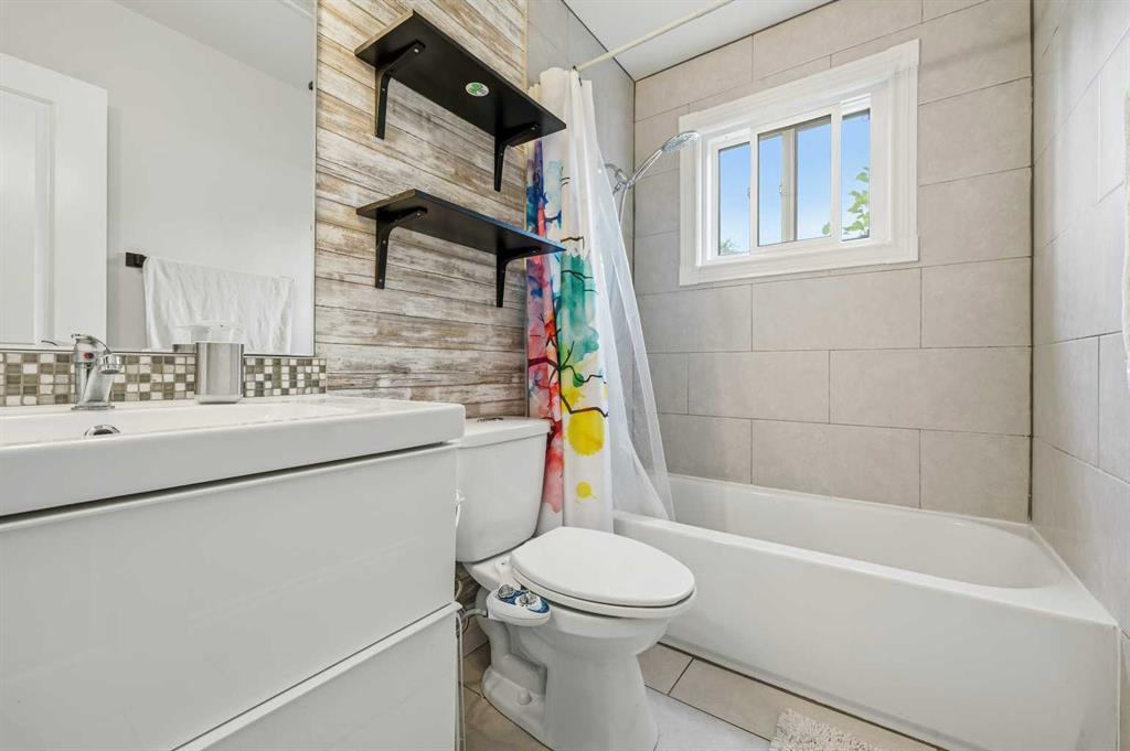 Inside, you’ll find Scandinavian slat accents throughout, hardwood flooring on the main level, and large north-facing windows that fill the home with natural light. The main floor features two comfortable bedrooms and a bright four-piece bathroom with a floating vanity and modern finishes.