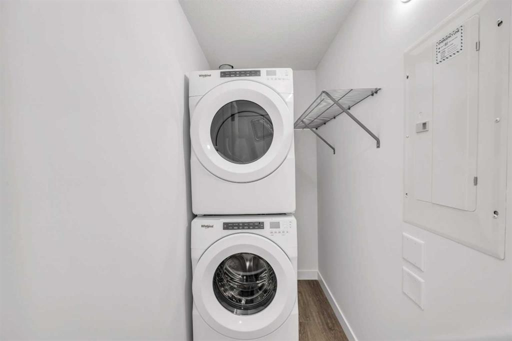 Inside, you’ll love the 9’ ceilings, luxury vinyl plank floors, quartz counters, and modern shaker-style cabinets with soft-close drawers. The unit comes with a spacious laundry room, roller shades, sleek LED lighting, and even rough-in for A/C. Step outside to your big balcony with a gas line for BBQs—perfect for summer nights and a storage locker included.