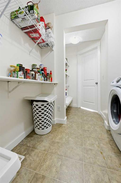 The main floor features a bright and welcoming great room with a corner gas fireplace, seamlessly connected to a gourmet kitchen complete with stainless steel appliances, laminate countertops, a large central island, and a walk-through pantry. A dining nook, main-floor laundry, and powder room add to the home’s everyday convenience.