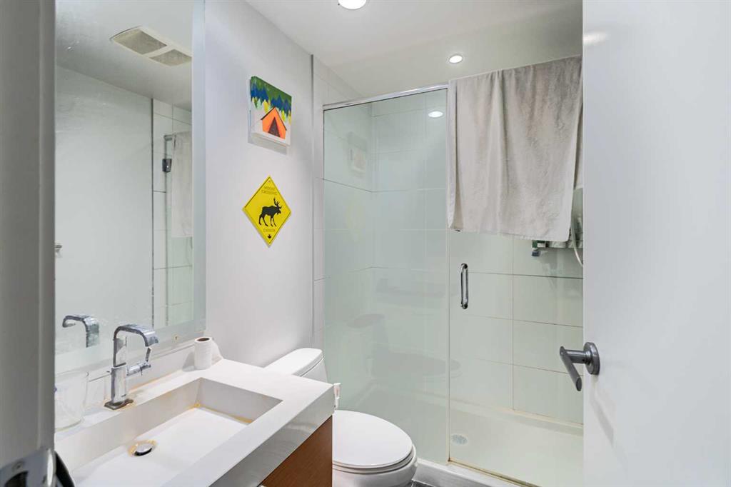 Fully furnished modern 1 bed/1bath condo unit on the "Flats Tower" of The Prestigious Waterfront Condo, Calgary's upscale Downtown neighborhood. Open concept floor plan, 9' ceilings, floor to ceiling windows. End unit & balcony is exposed to the view of the beautiful courtyard. Kitchen is fully equipped with high-end stainless steel appliances. Quartz central island & countertop. Full heights cabinetry. Bedroom has built-in head board, double bed-frame & 2 night tables. In-suite laundry & air conditioned. Unit includes an assigned parking stall & a storage locker. Enjoy living in a resort style building with superior amenities : concierge service, fitness facilities, hot tub, sauna, movie theatre, social lounge, outdoor garden patio, visitor parking & car wash. Move in & enjoy the lifestyle of a waterfront community along the Bow River & Princess Island Park. Walking distance to Downtown, Chinatown, East Village & Eau Claire Market, shops & restaurants. Bike or walk along the water path. Perfect for first time buyers or as an investment property. A great property to consider.